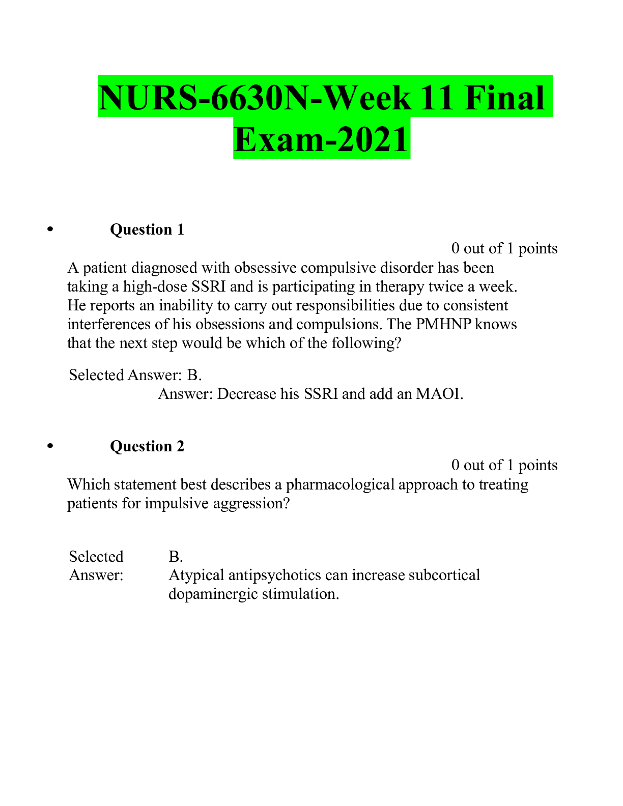 NURS-6630N-Week 11 Final Exam-2021-76 Q&A A patient diagnosed with obsessive compulsive disorder has been taking a high-dose SSRI and is participating in therapy twice a week. He reports an inabili...