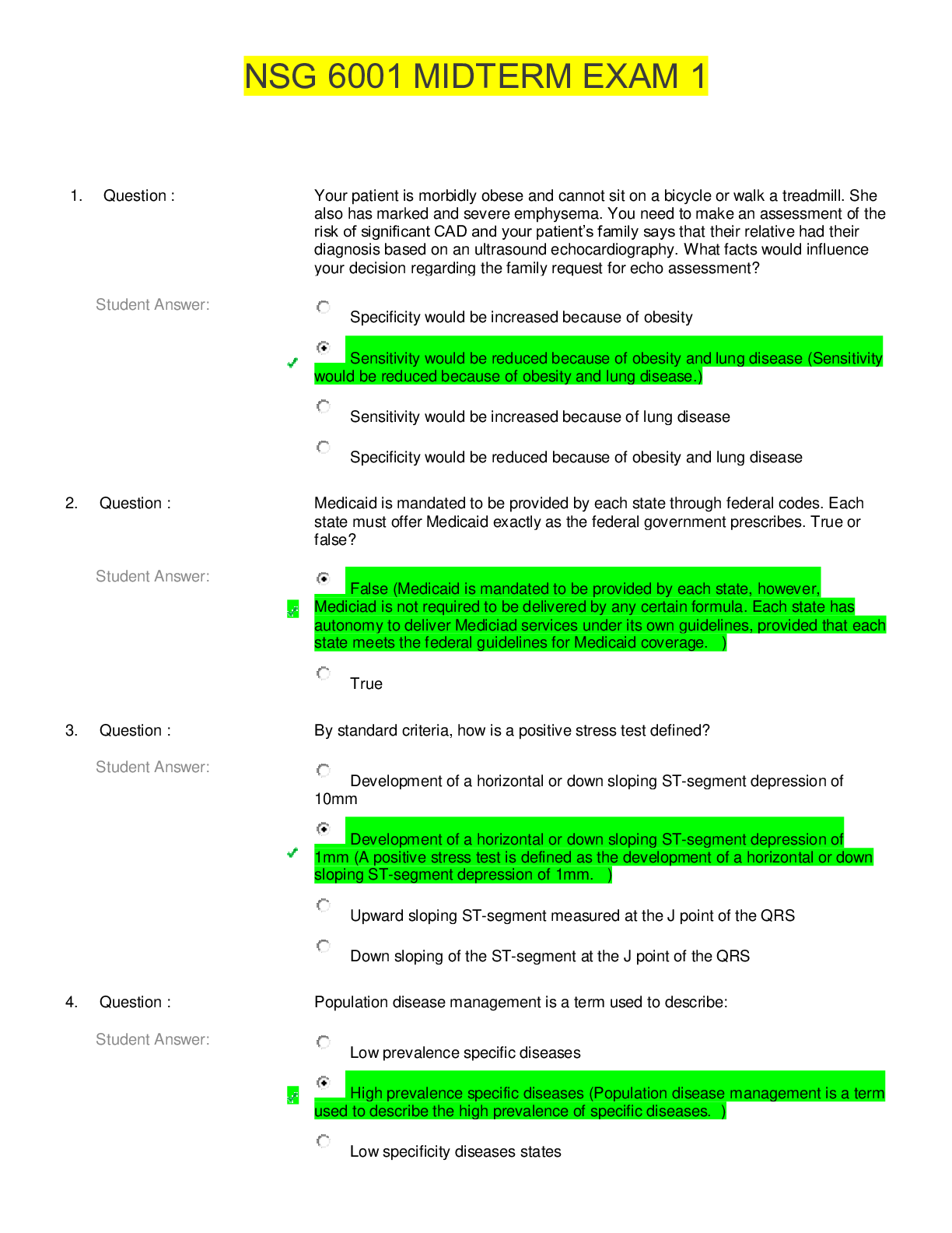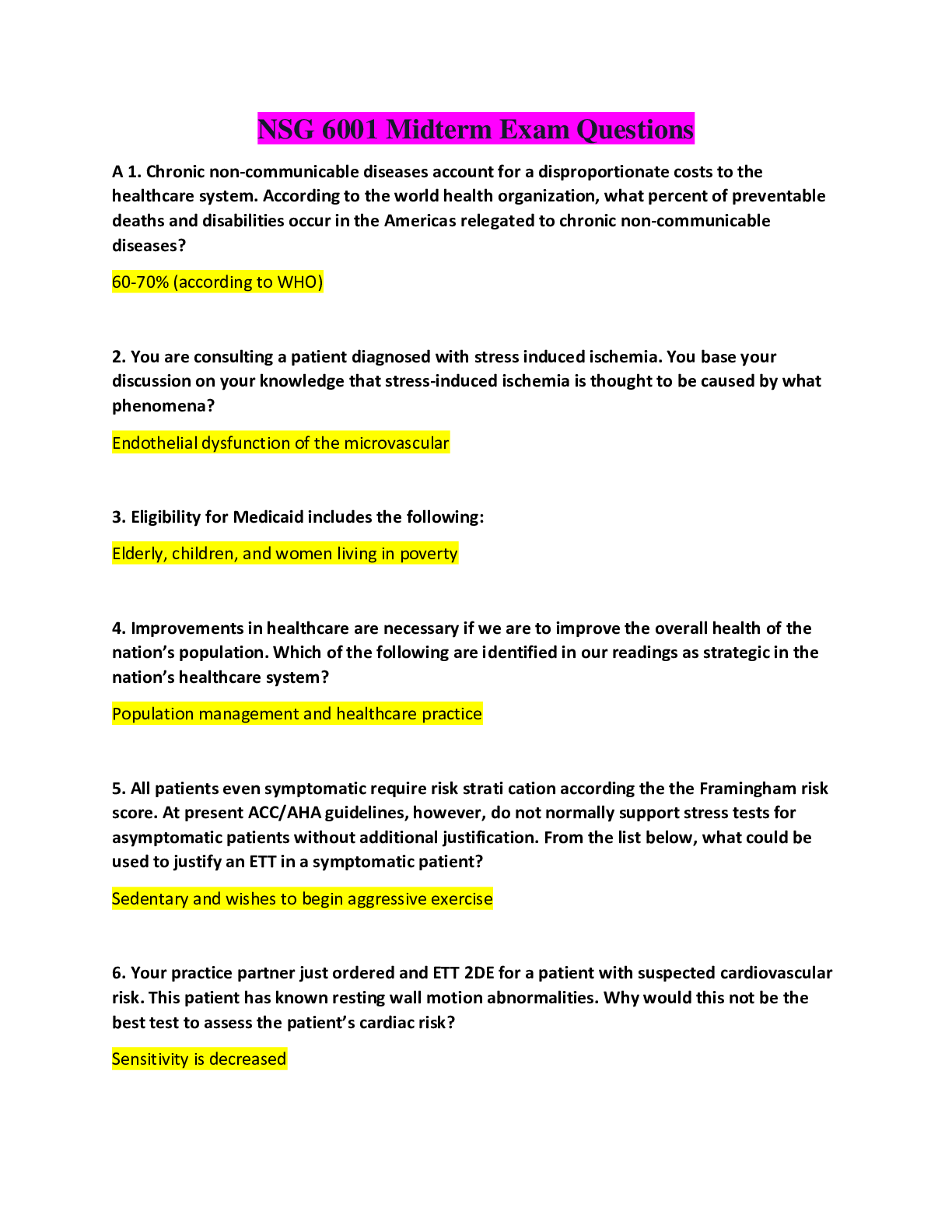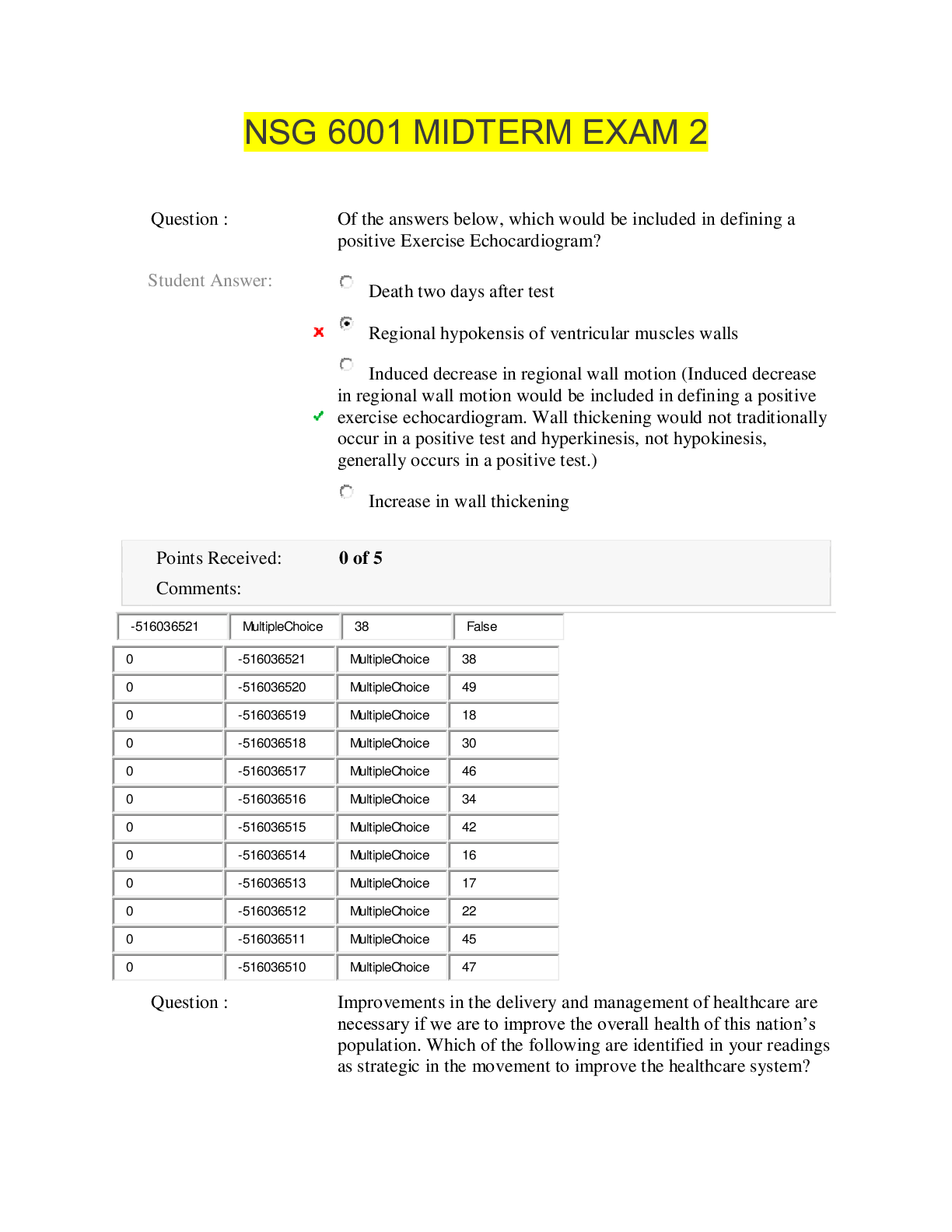 NSG 6001 Midterm Exam 2 1. Of the answers below, which would be included in defining a positive Exercise Echocardiogram? Question 19.Question :Improvements in the delivery and management of healthcar...