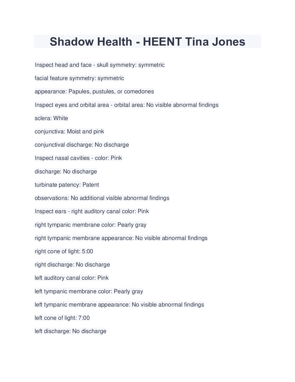 *NURSING> SHADOW HEALTH > Shadow Health - HEENT Tina Jones (Latest 2022/2023)/Shadow Health - HEENT Tina Jones (Latest 2022/2023) (All)