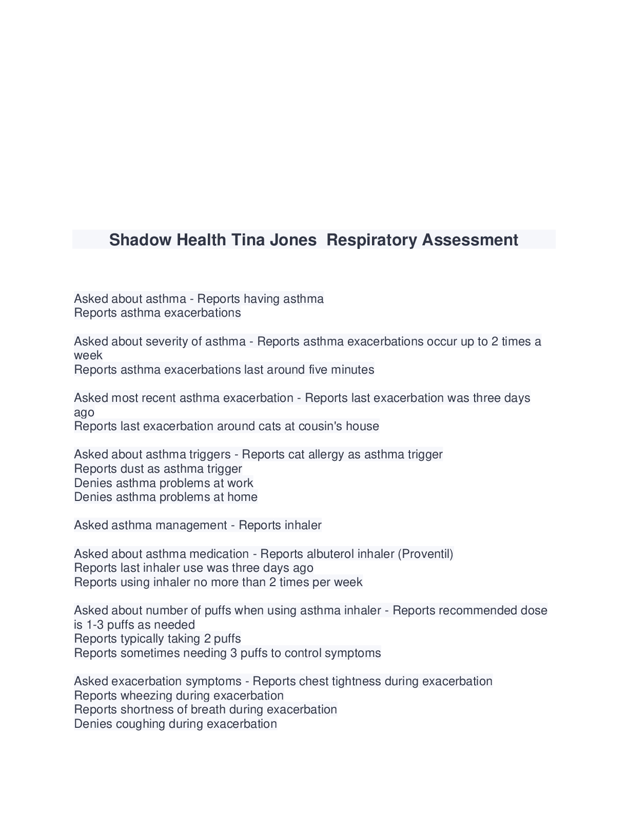 *NURSING> SHADOW HEALTH > Shadow Health | Tina Jones | Respiratory Assessment 2022/2023 (All)