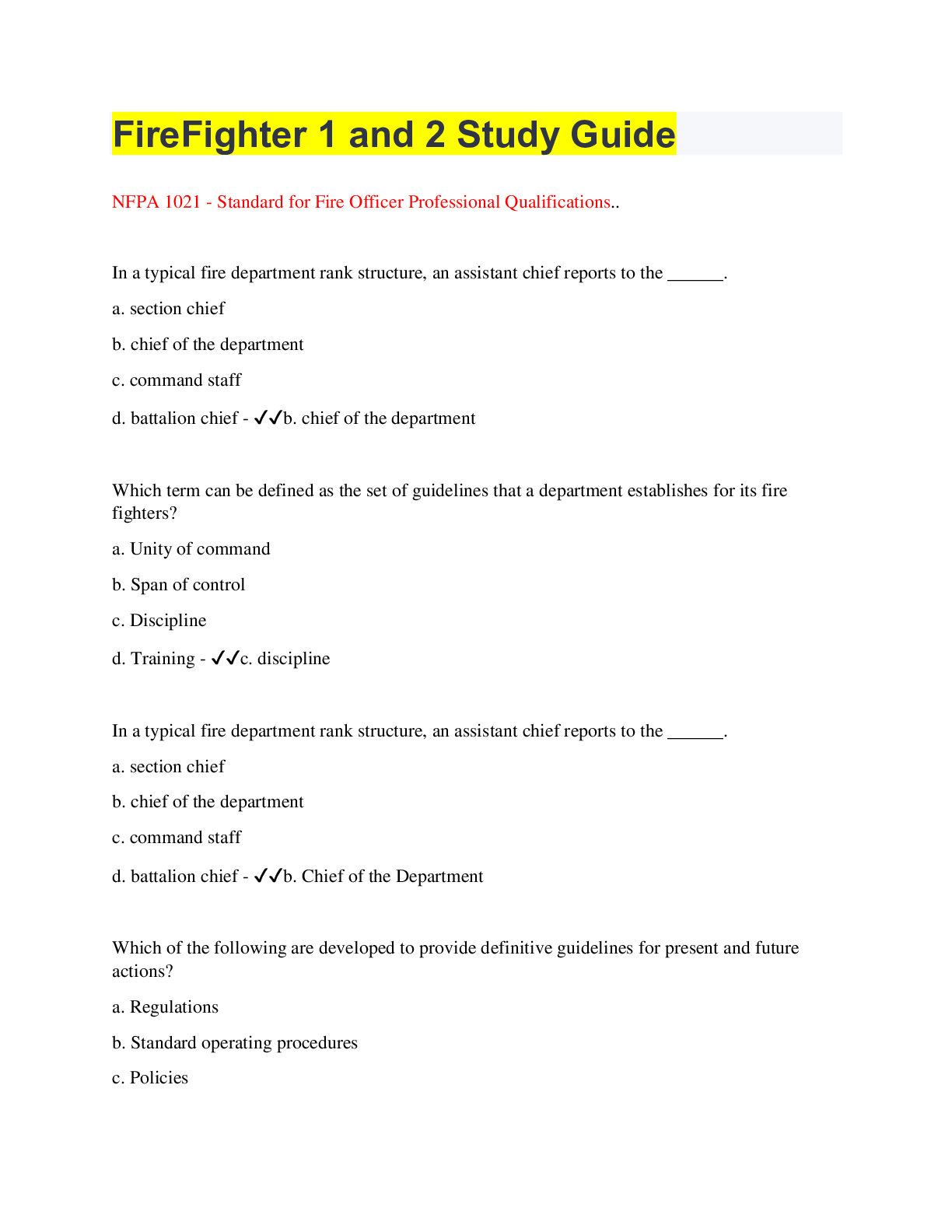 Education> STUDY GUIDE > FireFighter 1 and 2 Study Guide NFPA 1021 - Standard for Fire Officer Professional Qualifications.. (1798 Questions with COMPLETE SOLUTIONS) 407 PAGES (All)