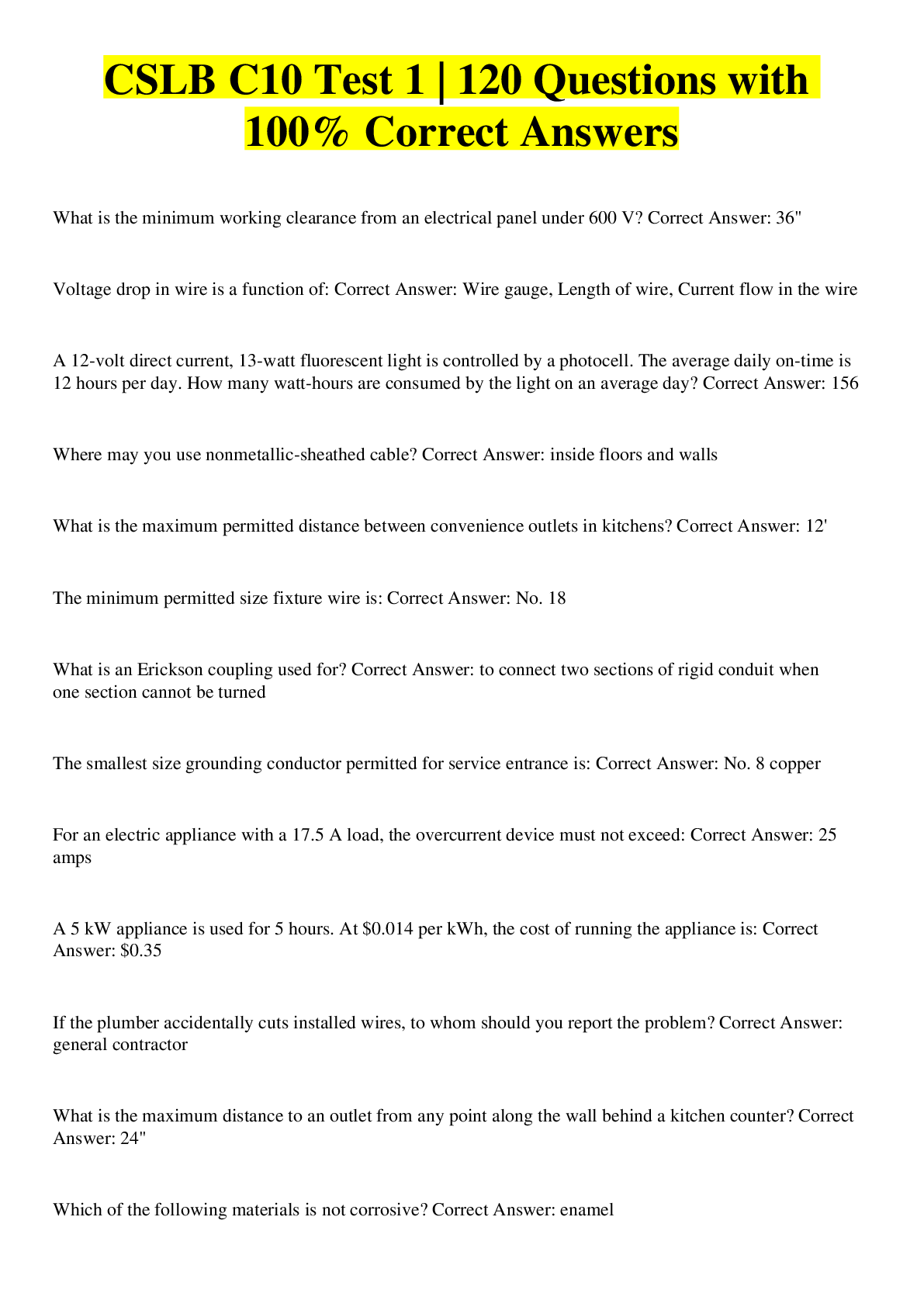 Law> EXAM > CSLB C10 CSLB C10 Test 1 | 120 Questions with 100% Correct Answers (All)