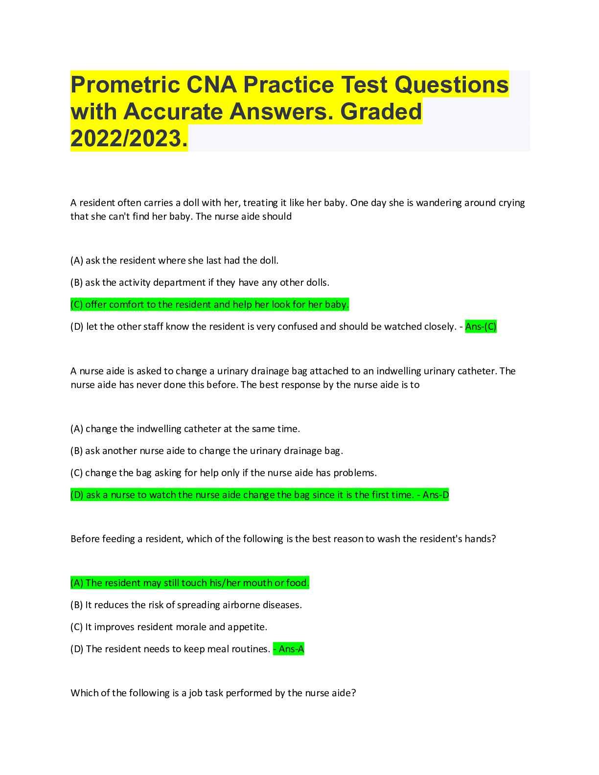 Medical Studies> QUESTIONS & ANSWERS > Prometric CNA Practice Test Questions with Accurate Answers. Graded 2022/2023 (All)