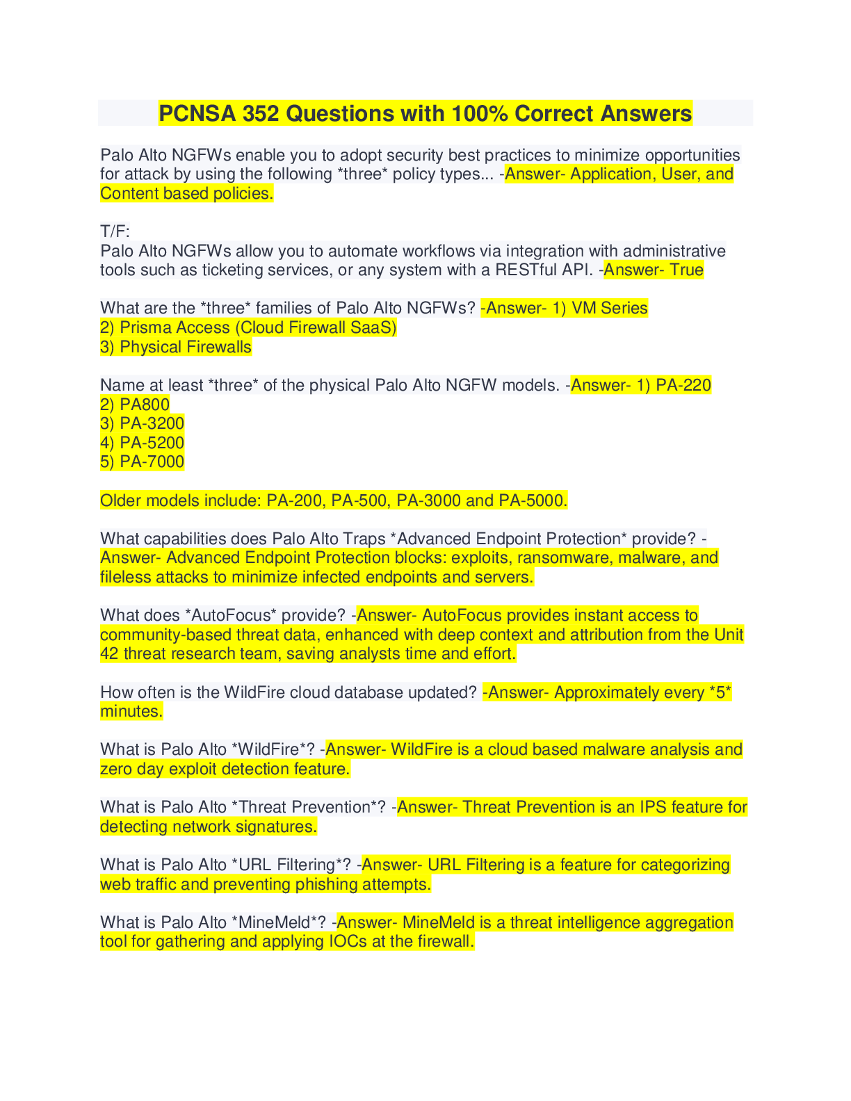 Computer Networking> QUESTIONS & ANSWERS > PCNSA 352 Questions with 100% Correct Answers (All)