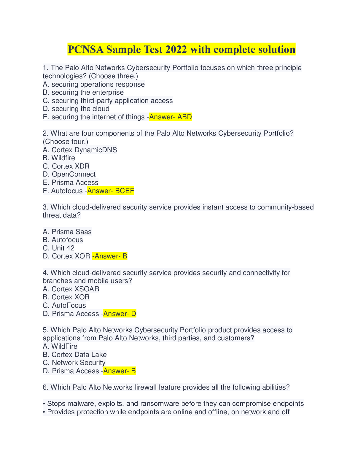 PCNSA Sample Test 2022 with complete solution 1. The Palo Alto Networks Cybersecurity Portfolio focuses on which three principle technologies? (Choose three.) A. securing operations response B. s...