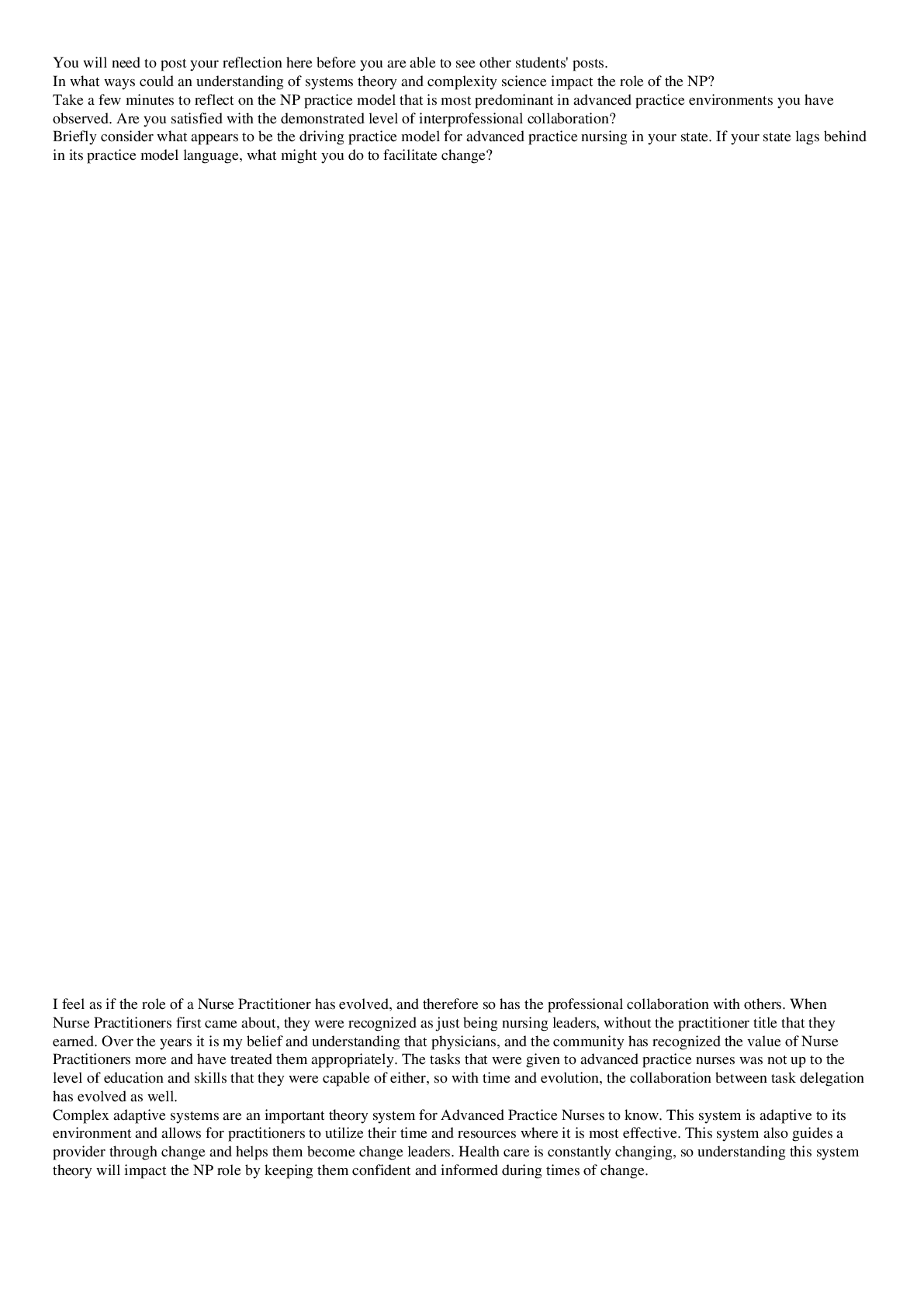 NR 599 Week 5 Assignment: Reflection Questions You will need to post your reflection here before you are able to see other students' posts. In what ways could an understanding of systems theor...