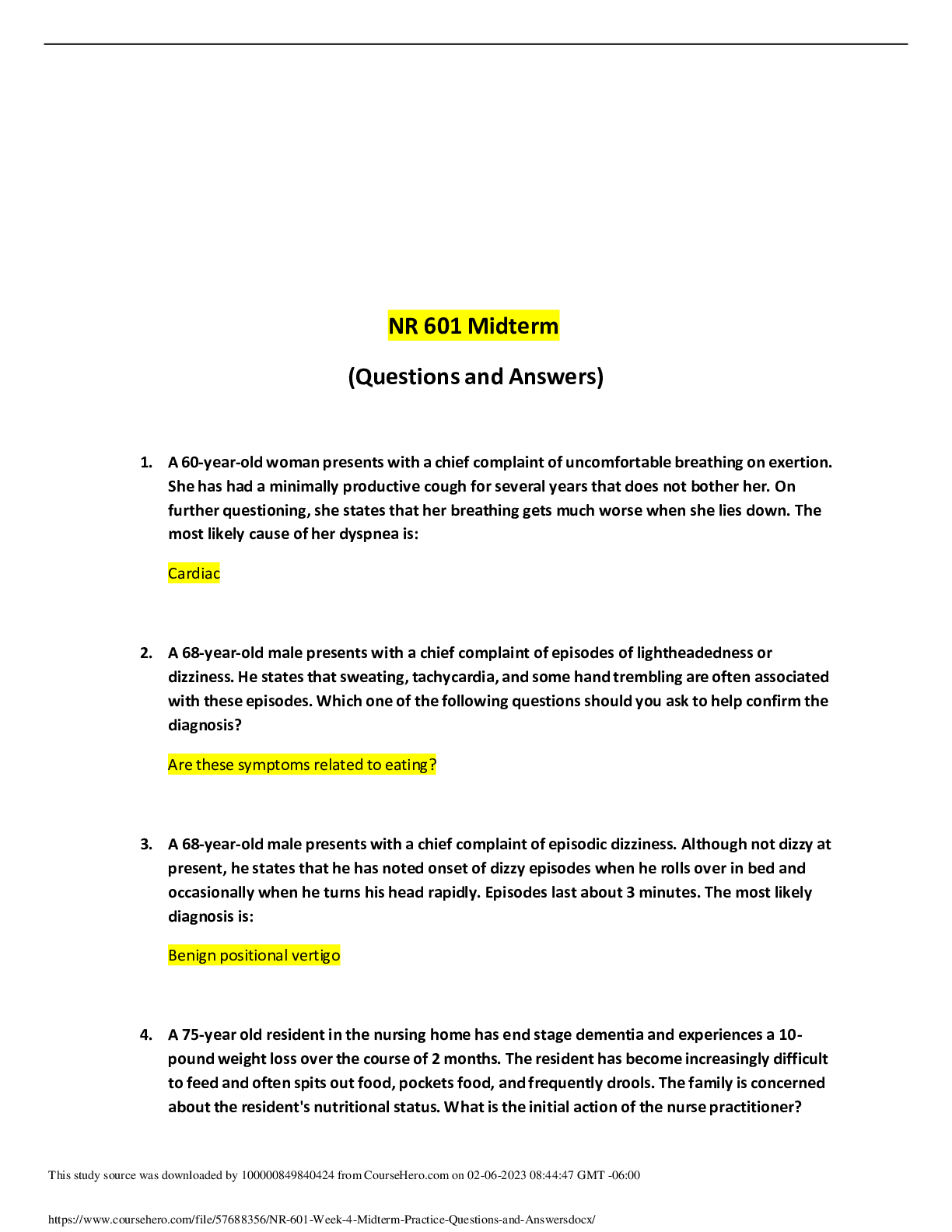 NR 601 Week 4 Midterm Exam - Questions and Answers 2020 Question: A 60-year-old woman presents with a chief complaint of uncomfortable breathing on exertion. She has had a minimally productive cough...