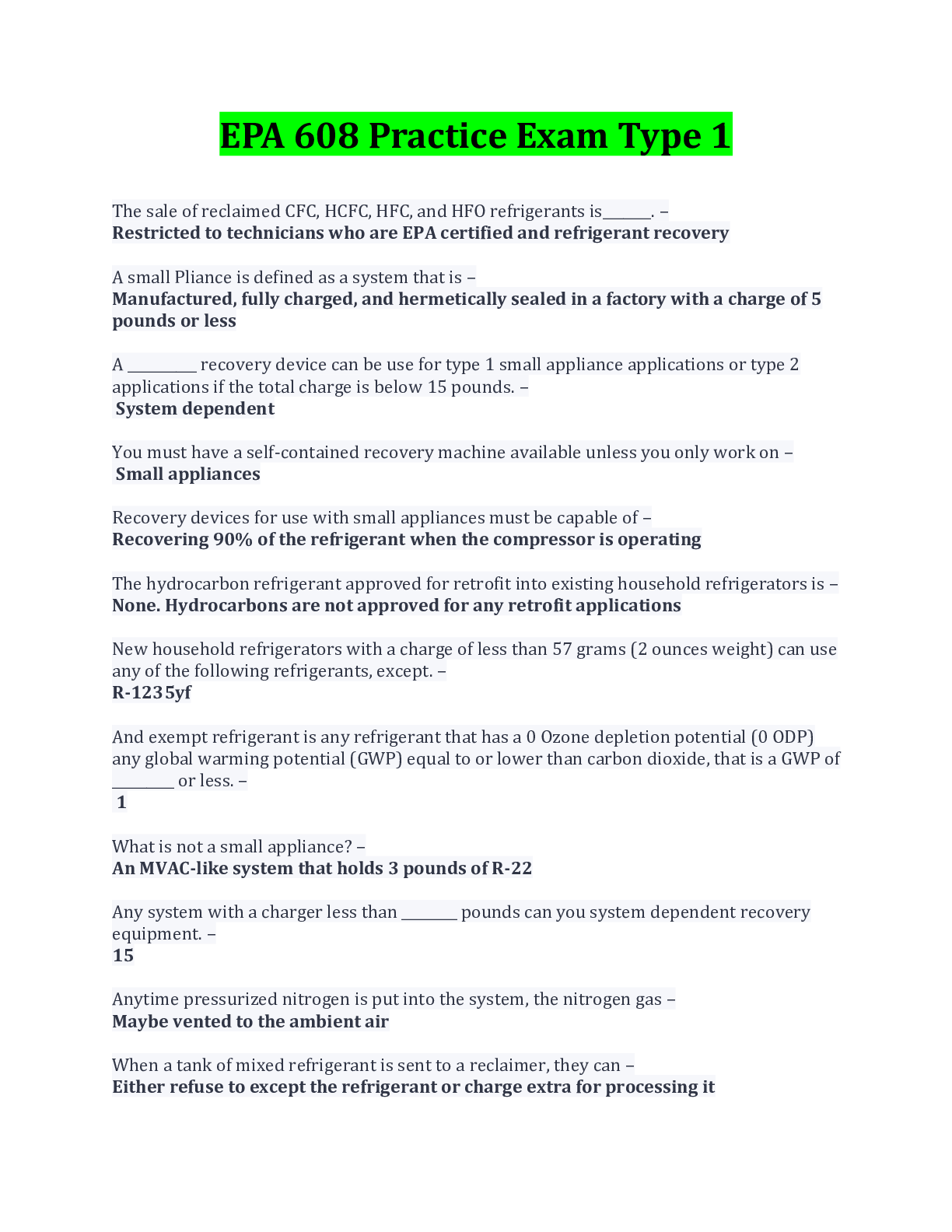 EPA 608 Practice Exam Type 1 Questions And Answers With Complete Solution Latest Update.