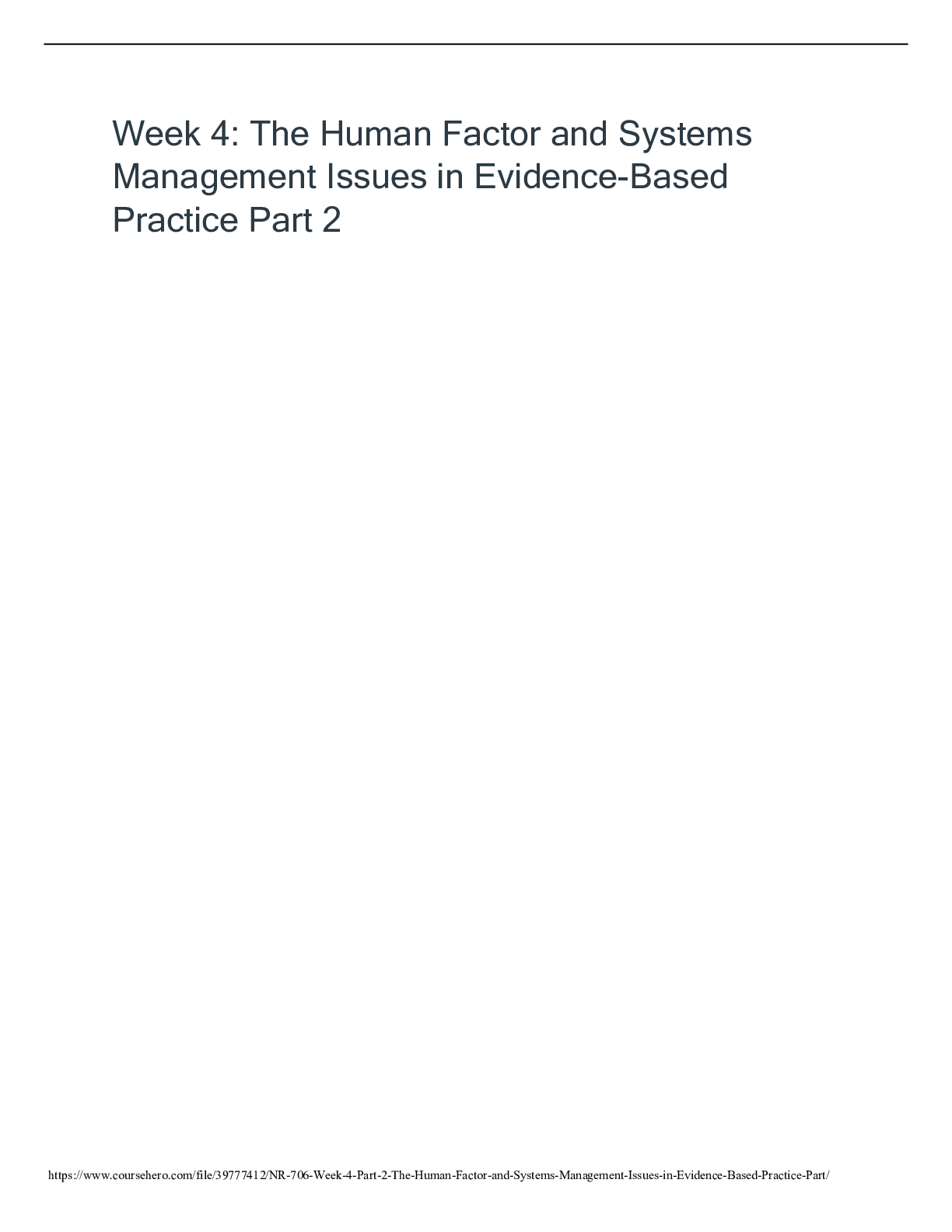 NR 706 Week 4 Discussion Topic 2; The Human Factor and Systems Management Issues in Evidence-Based Practice How have you seen human factors and systems management at work in your advanced nursing p...
