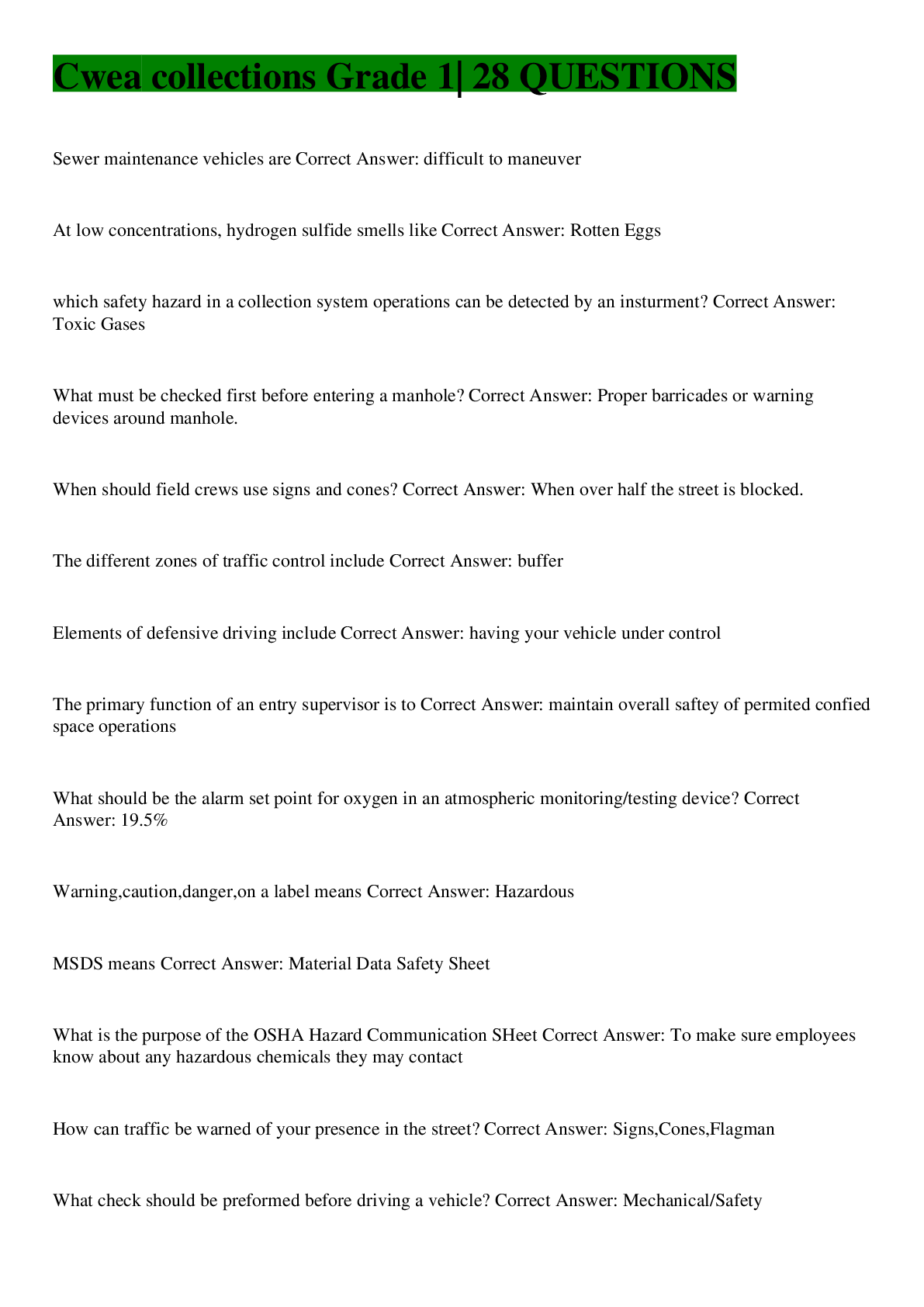 Sewer maintenance vehicles are Correct Answer: difficult to maneuver At low concentrations, hydrogen sulfide smells like Correct Answer: Rotten Eggs which safety hazard in a collection system...