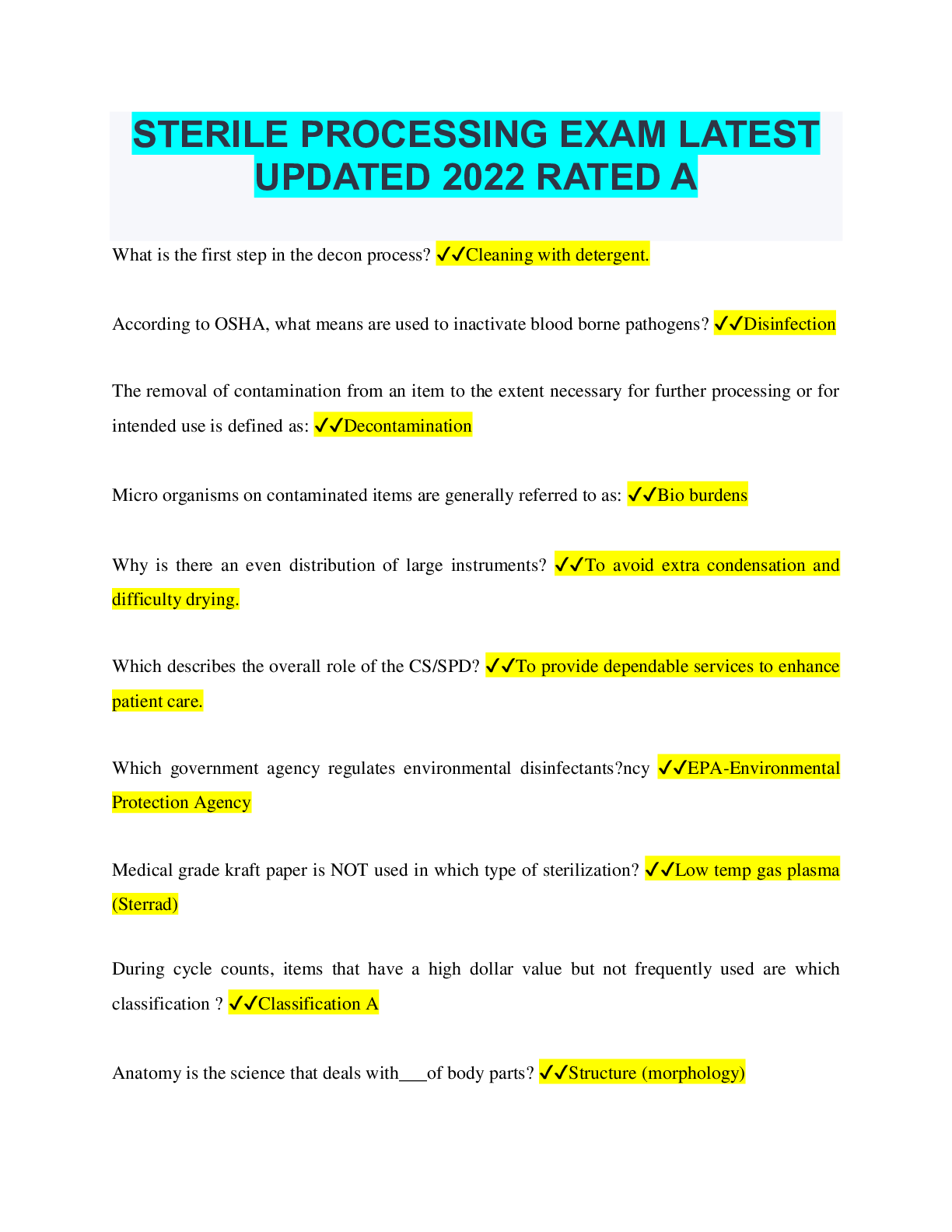 Health Care> EXAM > C.S. Certification Exam, SPD Test, Sterile Processing Study Material for Certification Exam Latest 2022 Already Passed (All)