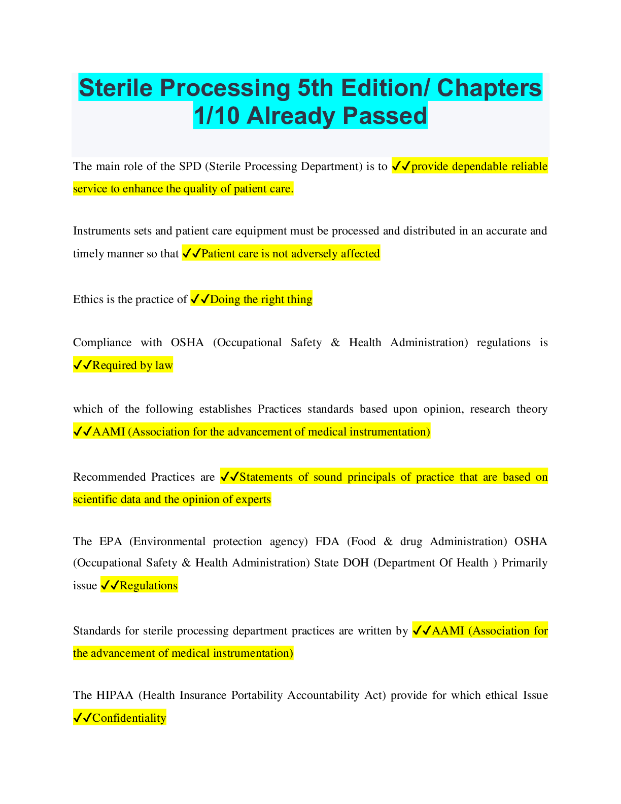 Health Care> EXAM > Sterile Processing 5th Edition/ Chapters 1/10 Already Passed (All)