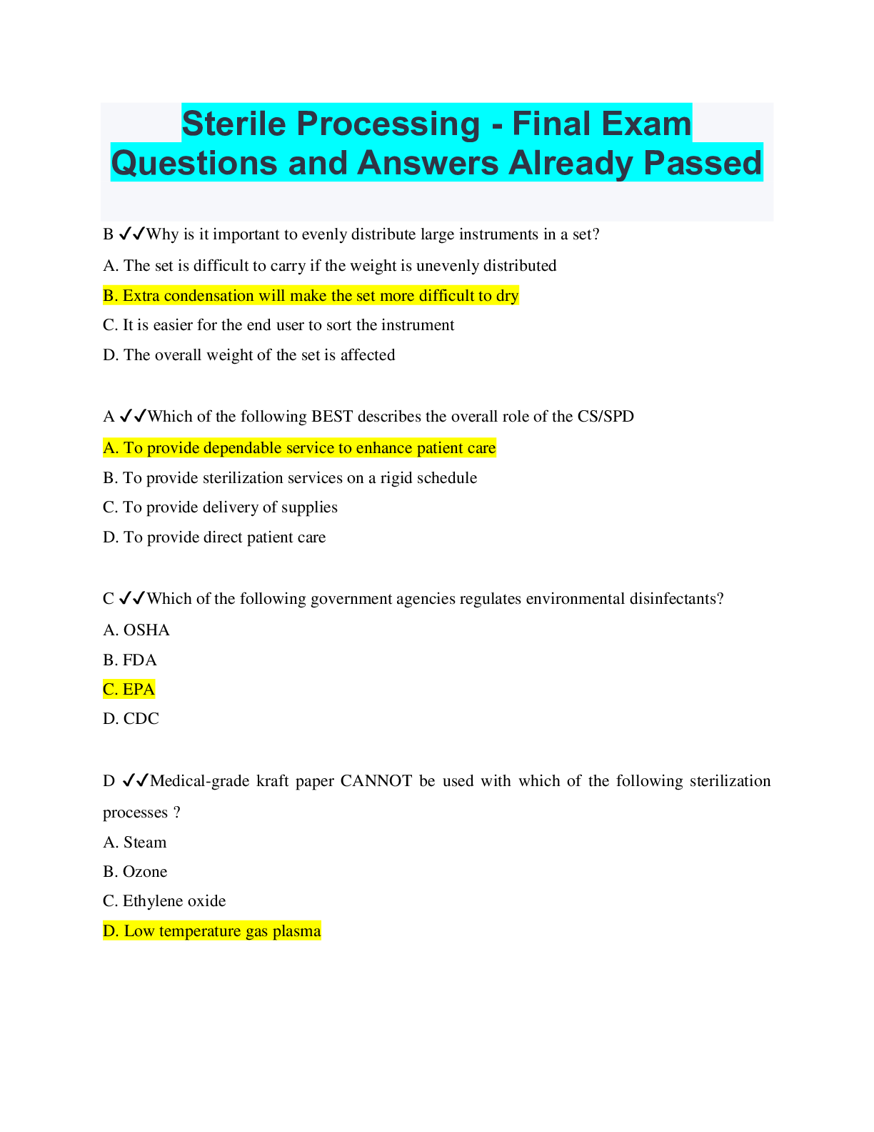 Health Care> EXAM > Sterile Processing - Final Exam Questions and Answers Already Passed (All)