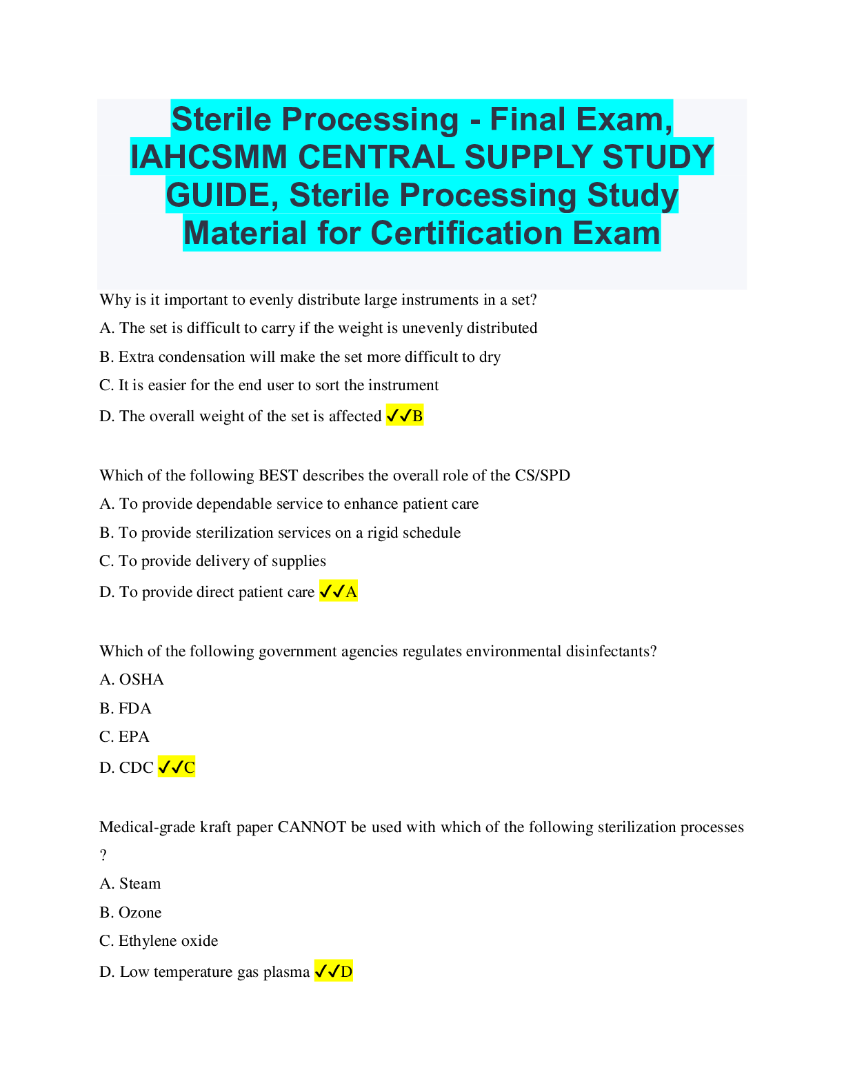 Health Care> EXAM > Sterile Processing - Final Exam, IAHCSMM CENTRAL SUPPLY STUDY GUIDE, Sterile Processing Study Material for Certification Exam (All)