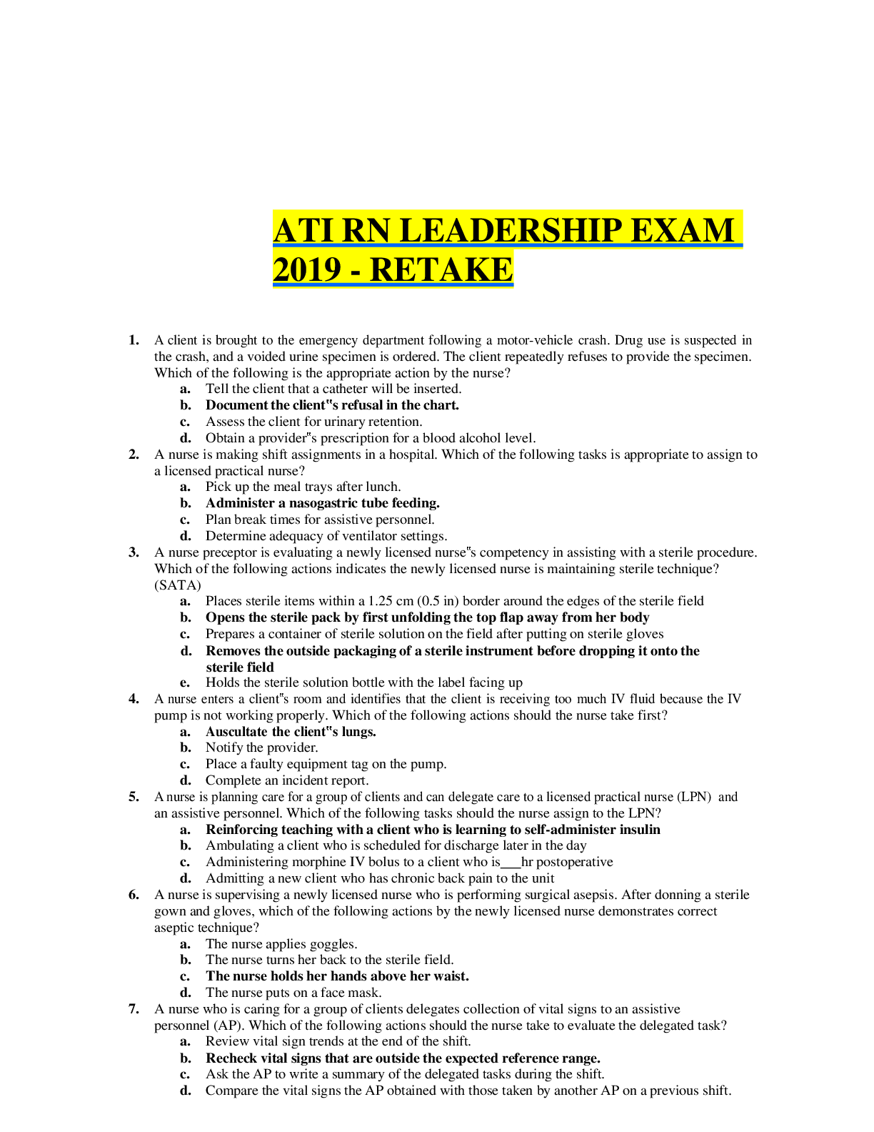 *NURSING> ATI > ATI RN LEADERSHIP EXAM 2019 - RETAKE 1 (All)