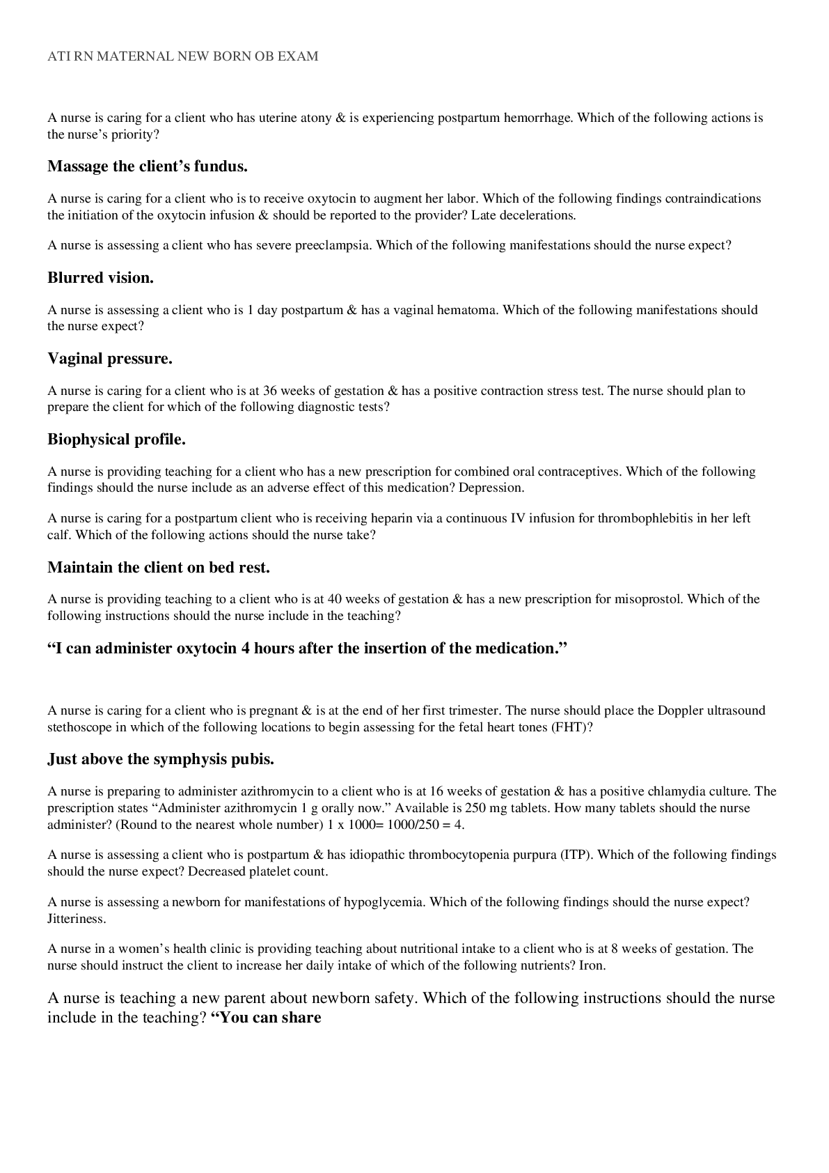 ATI RN MATERNAL NEW BORN OB EXAM 2022/2023/////ATI RN MATERNAL NEW BORN OB EXAM 2022/2023