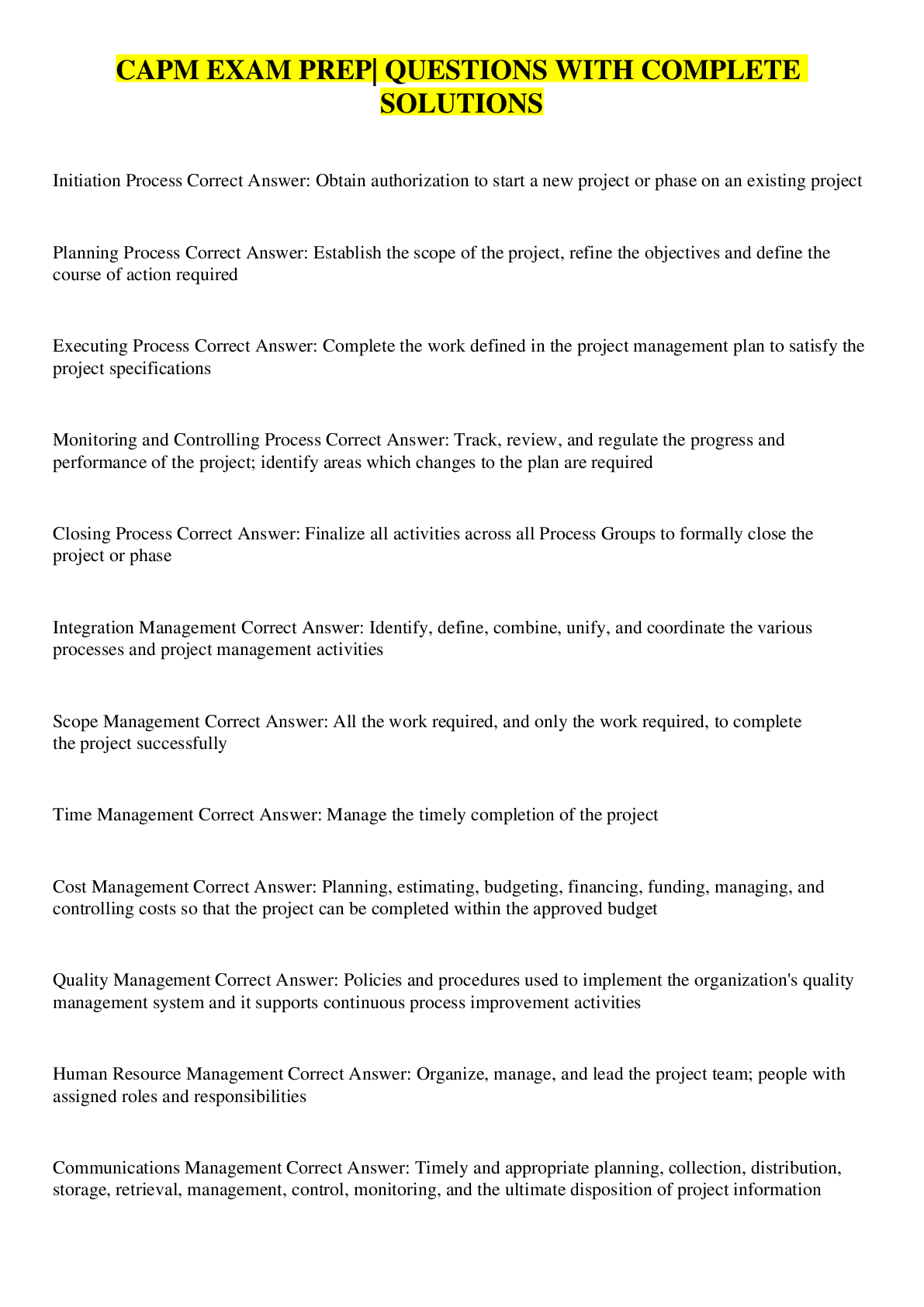 Education> EXAM > Certified Associate in Project Management (CAPM) Test Questions with Complete Solution (All)