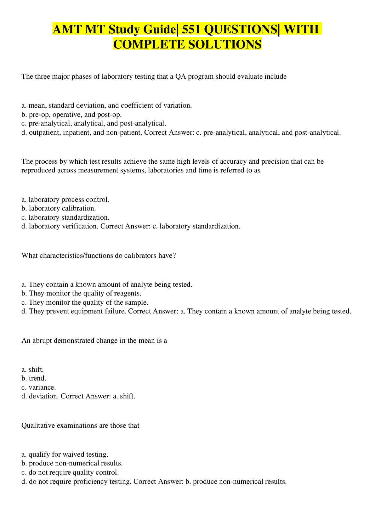 Health Care> EXAM > AMT MT Study Guide| 551 QUESTIONS| WITH COMPLETE SOLUTIONS (All)