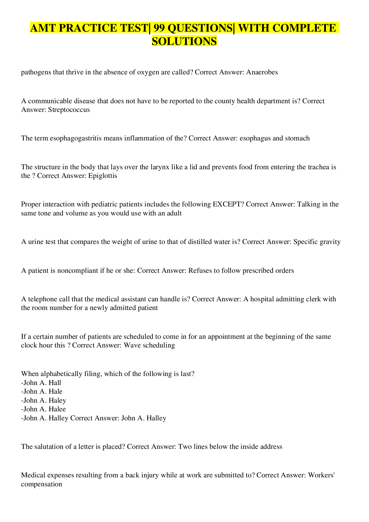 Health Care> EXAM > AMT PRACTICE TEST| 99 QUESTIONS| WITH COMPLETE SOLUTIONS (All)