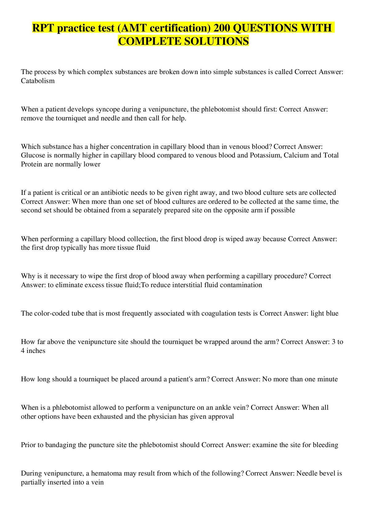 Health Care> EXAM > RPT practice test (AMT certification) 200 QUESTIONS WITH COMPLETE SOLUTIONS (All)
