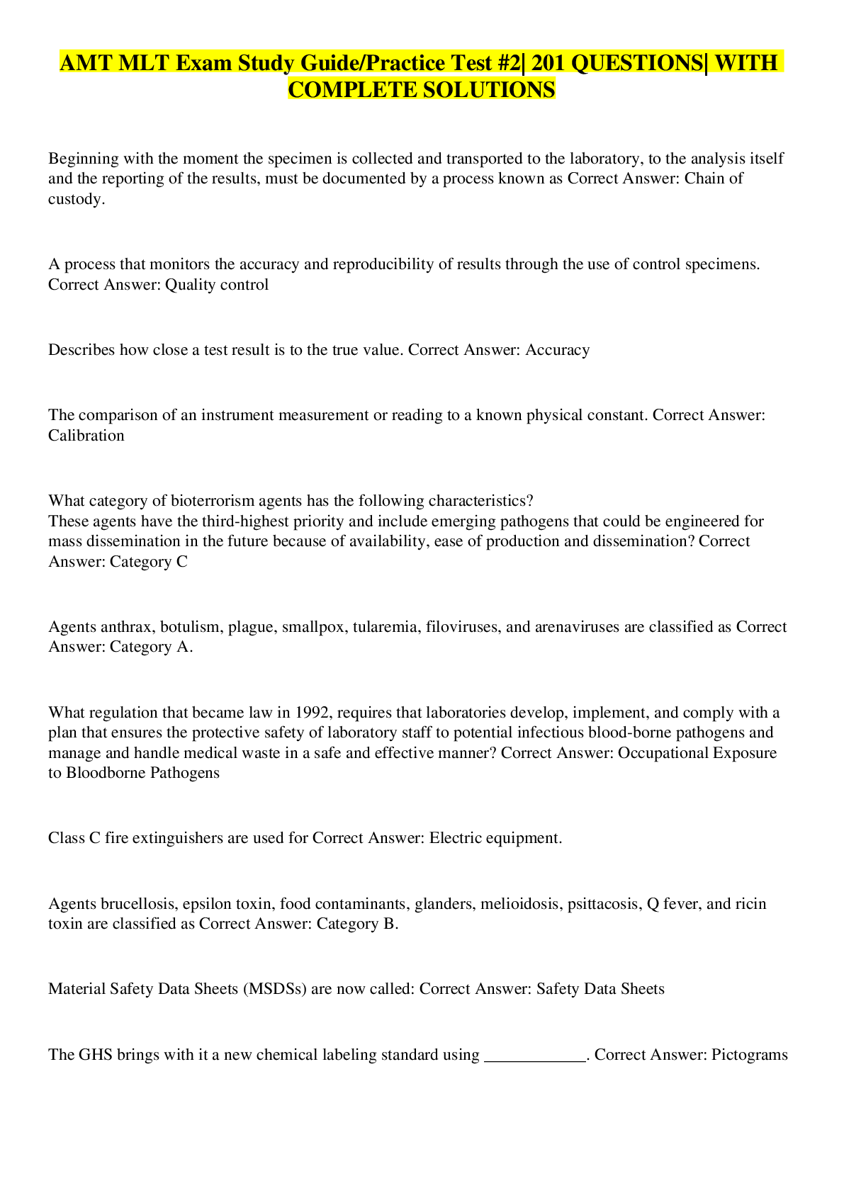 Health Care> EXAM > AMT MLT Practice test/Study Guide| 204 QUESTIONS| WITH COMPLETE SOLUTIONS (All)