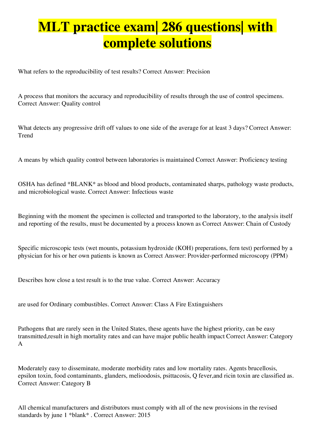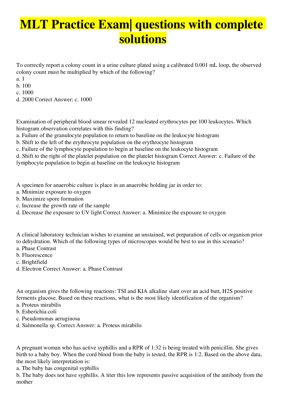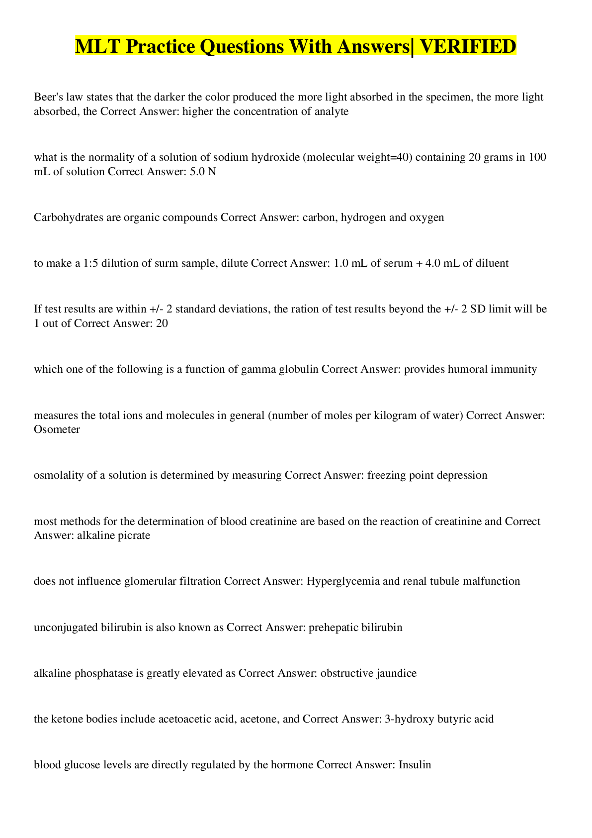 Health Care> EXAM > MLT Practice Questions With Answers| VERIFIED (All)
