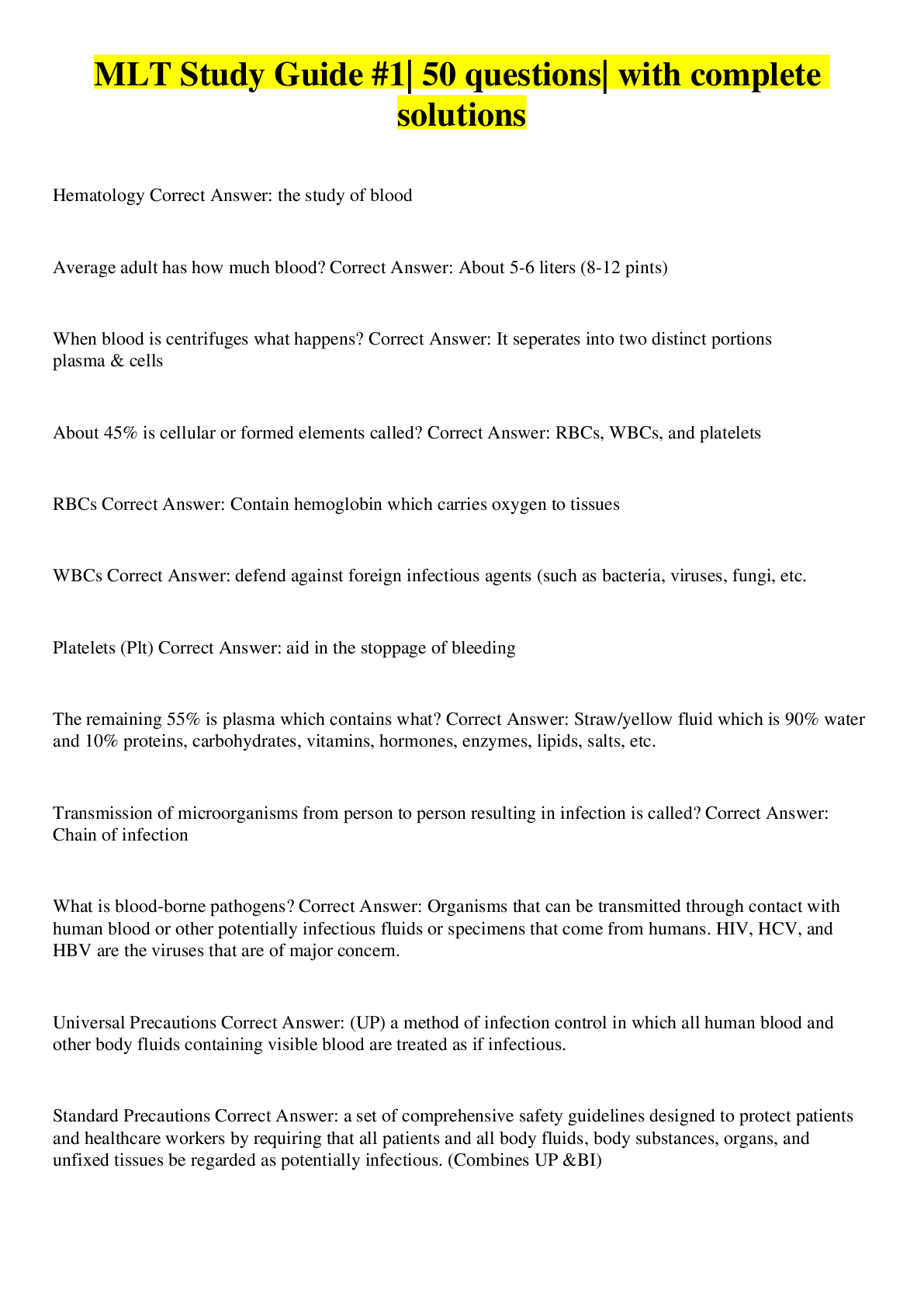 Health Care> EXAM > MLT Study Guide #1| 50 questions| with complete solutions (All)