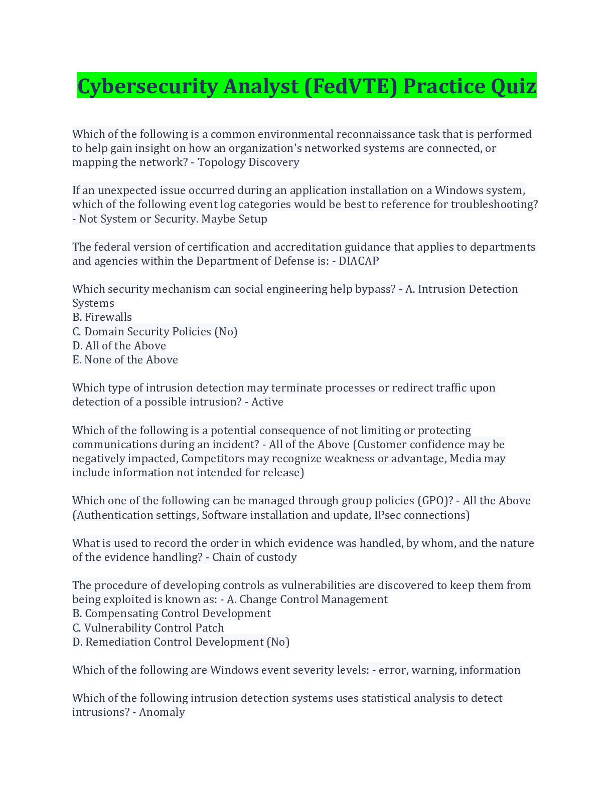 Computer Science> EXAM > Cybersecurity Analyst (FedVTE) Practice Quiz With Complete Solution (All)