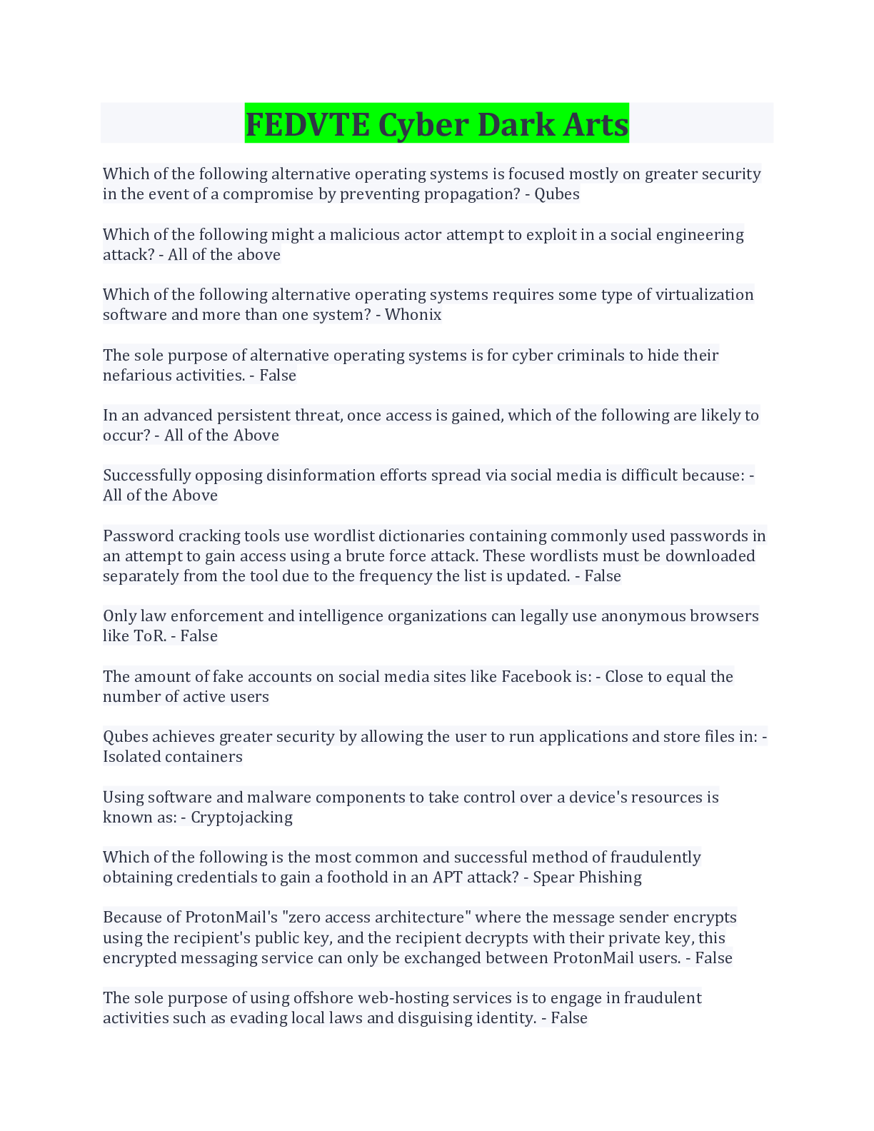 FEDVTE Cyber Dark Arts Questions And Answers With Complete Solution