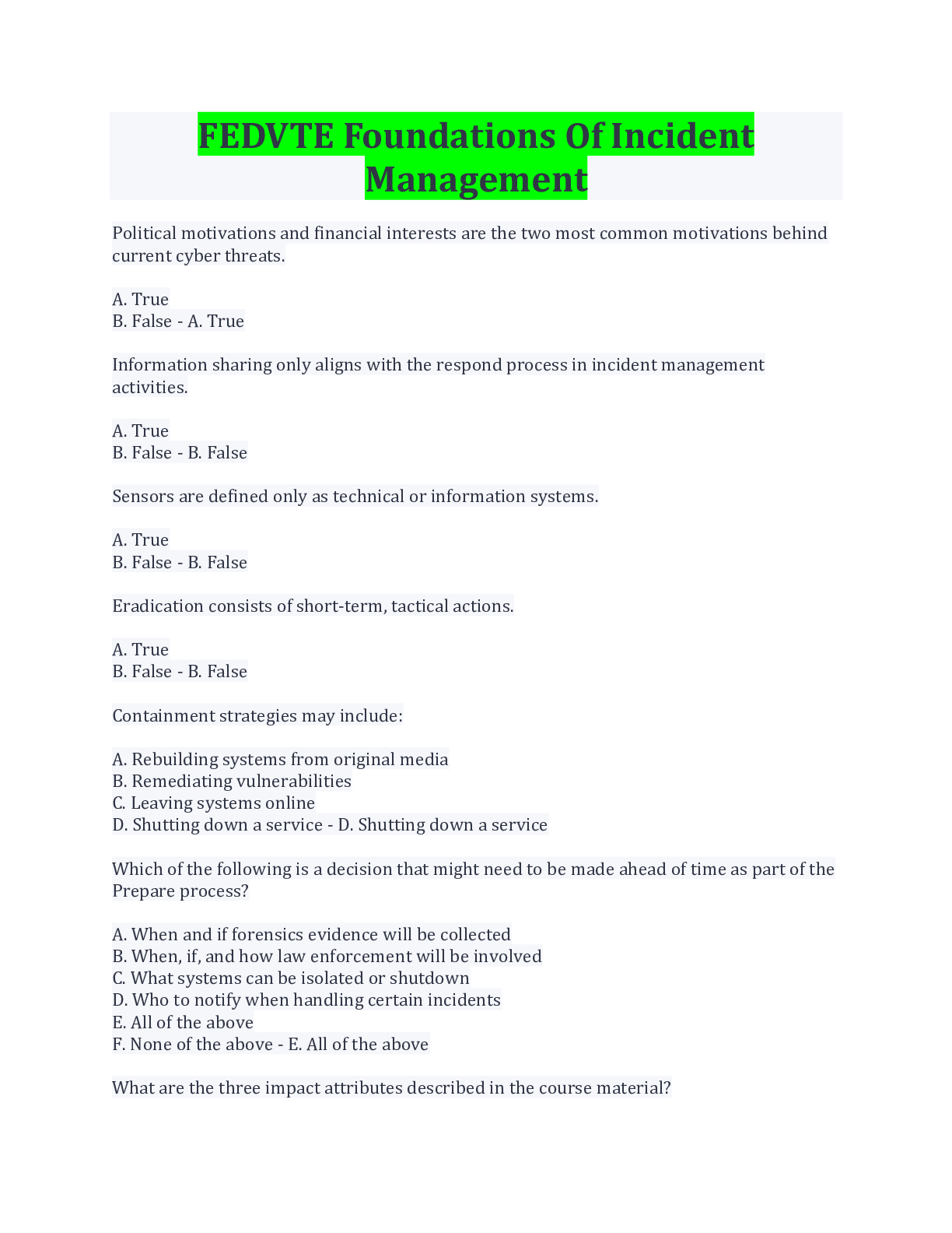 Computer Science> EXAM > FEDVTE Foundations Of Incident Management Questions And Answers Latest Update (All)