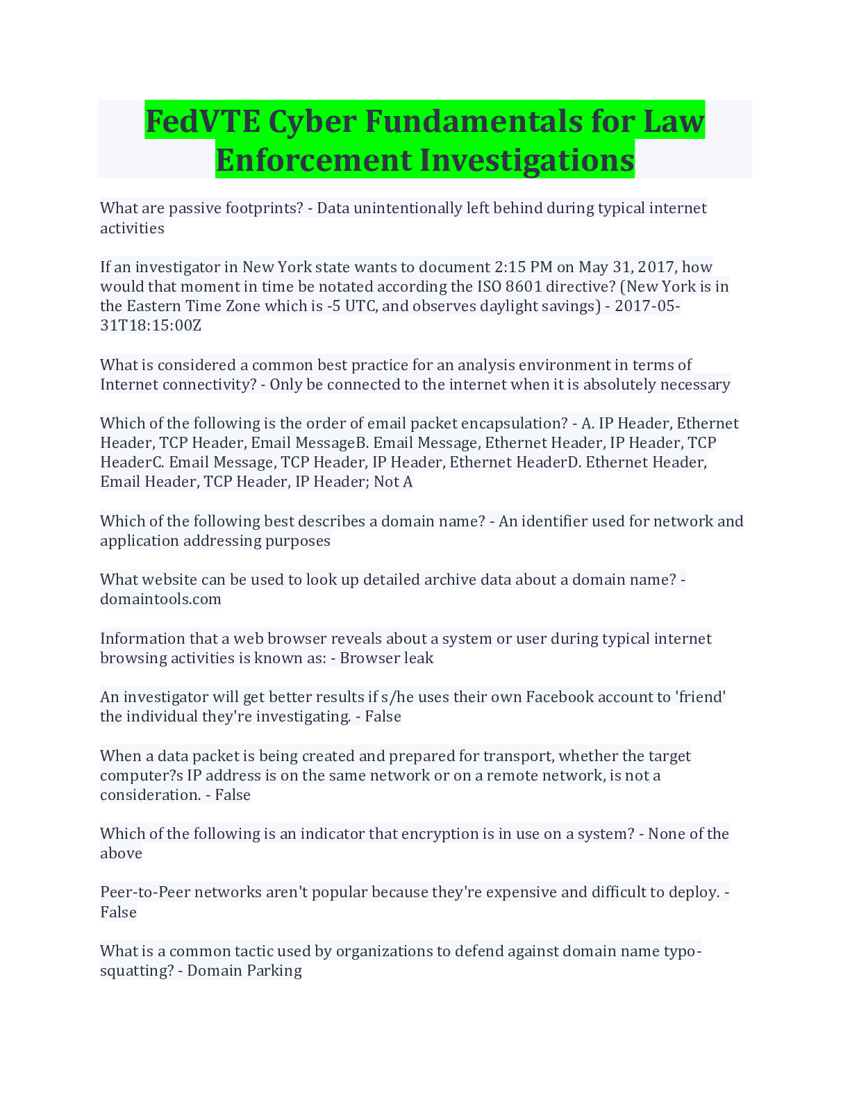 Computer Science> EXAM > FedVTE Cyber Fundamentals for Law Enforcement Investigations With Complete Solution (All)