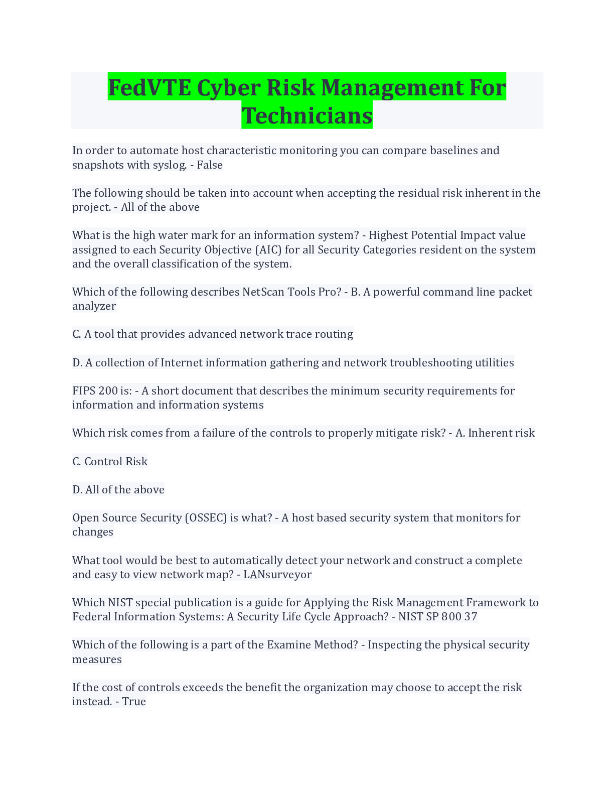 Computer Science> EXAM > FedVTE Cyber Risk Management For Technicians Questions And Answers Latest Update (All)