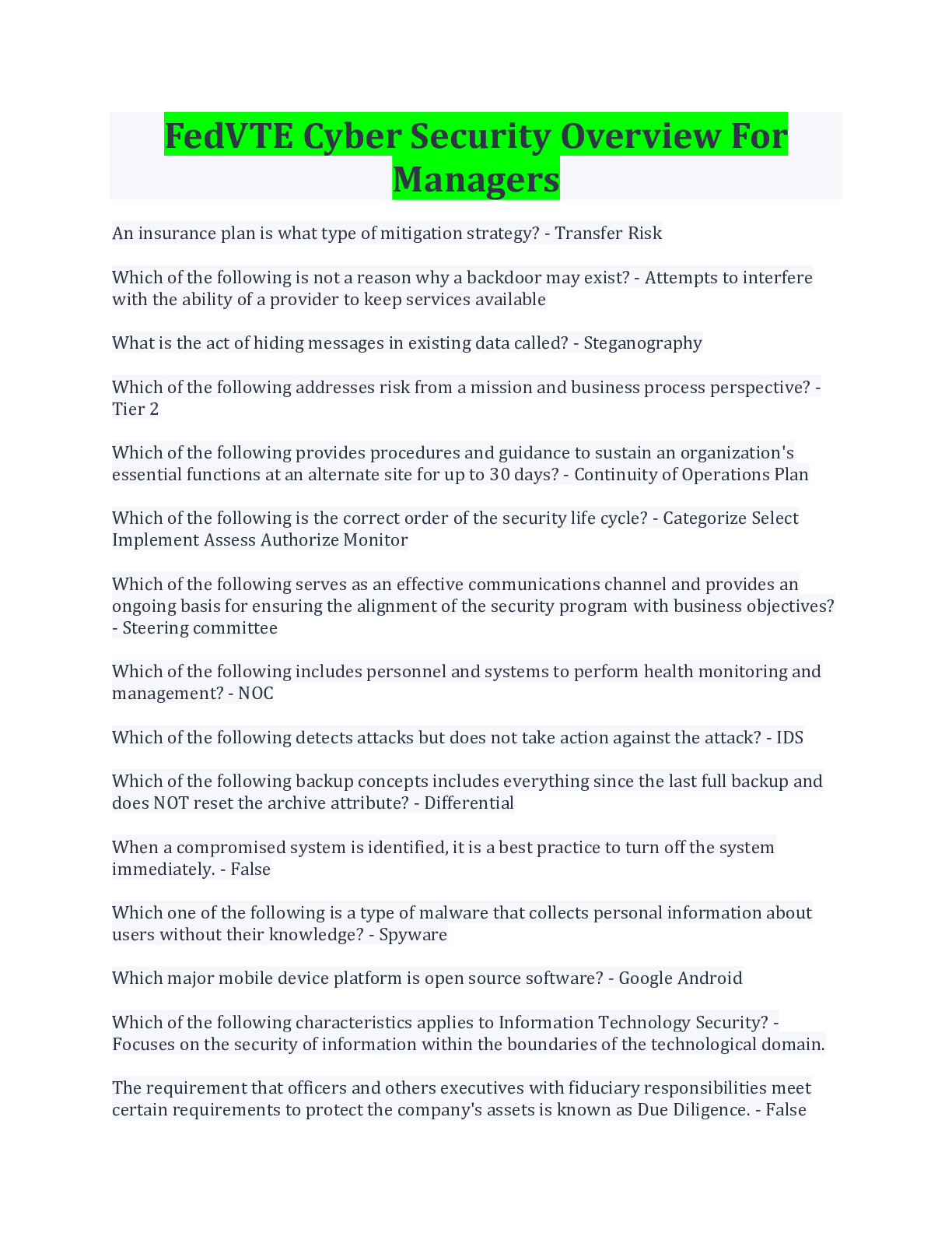 FedVTE Cyber Security Overview For Managers Latest Update Questions And Answers
