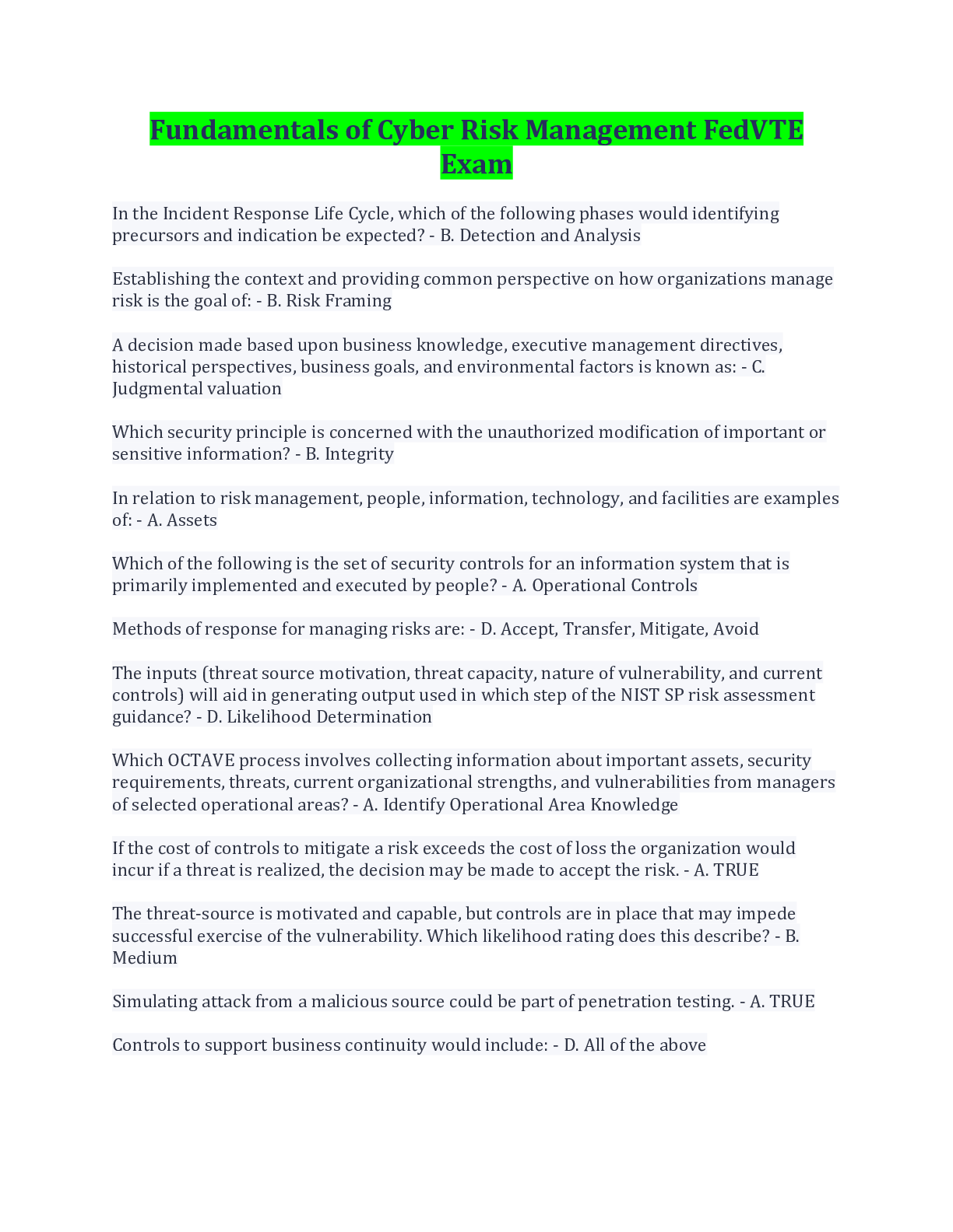 Computer Science> EXAM > Fundamentals of Cyber Risk Management FedVTE Exam Questions And Answers (All)