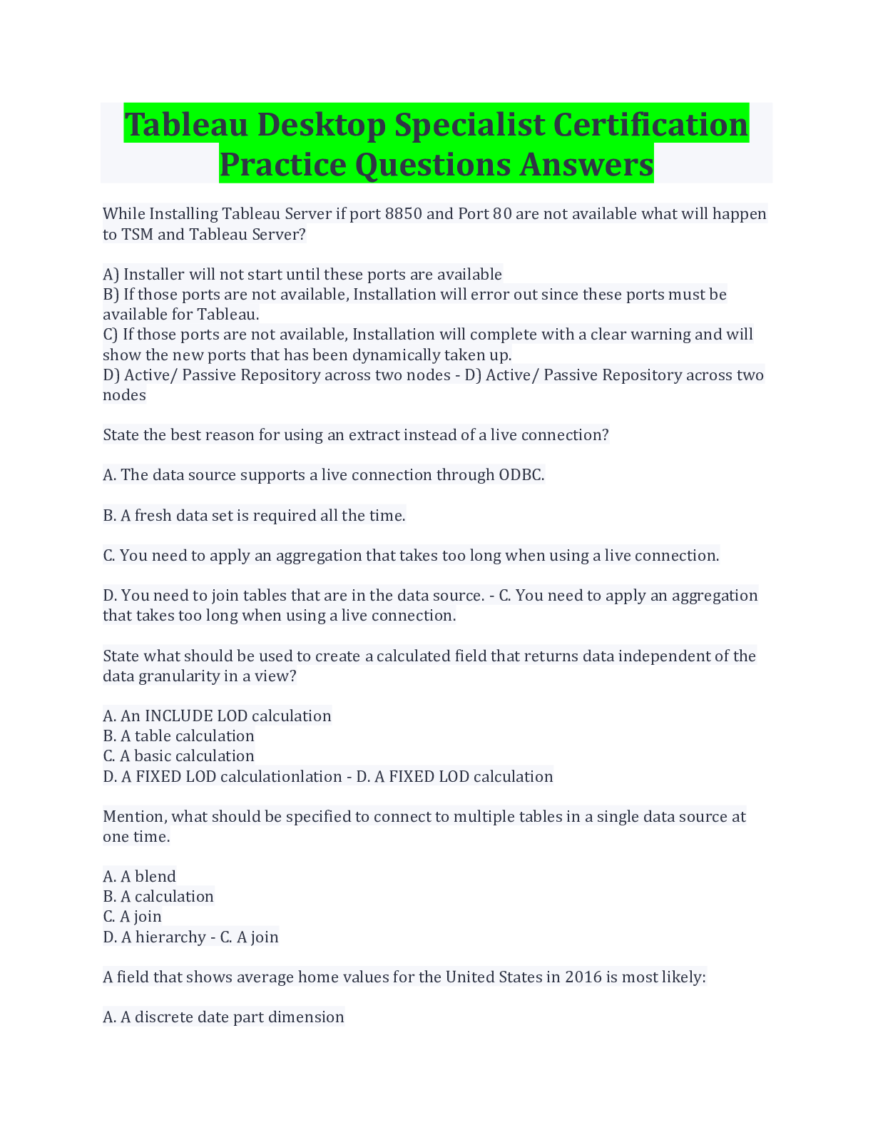 Computer Science> EXAM > Tableau Desktop Specialist Certification Practice Questions Answers Latest Update (All)