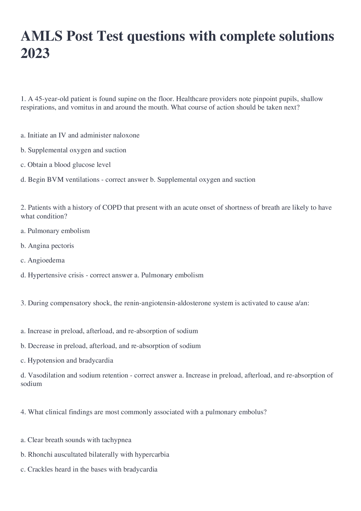 AMLS Pretest v 1.11 questions l Fully solved 2023 Medical/AMLS Final review latest 2023 graded A+ to pass AMLS Final questions with complete solution latest 2023 Advanced Medical Life Support... AMLS Review(updated)latest 2023 graded A+ AMLS Final questions and answers latest 2023 AMLS Test questions and answers latest 2023 AMLS Post Test 2021(updated) 3rd Edition correctly answered AMLS Post Test questions with complete solutions 2023 [Show More]