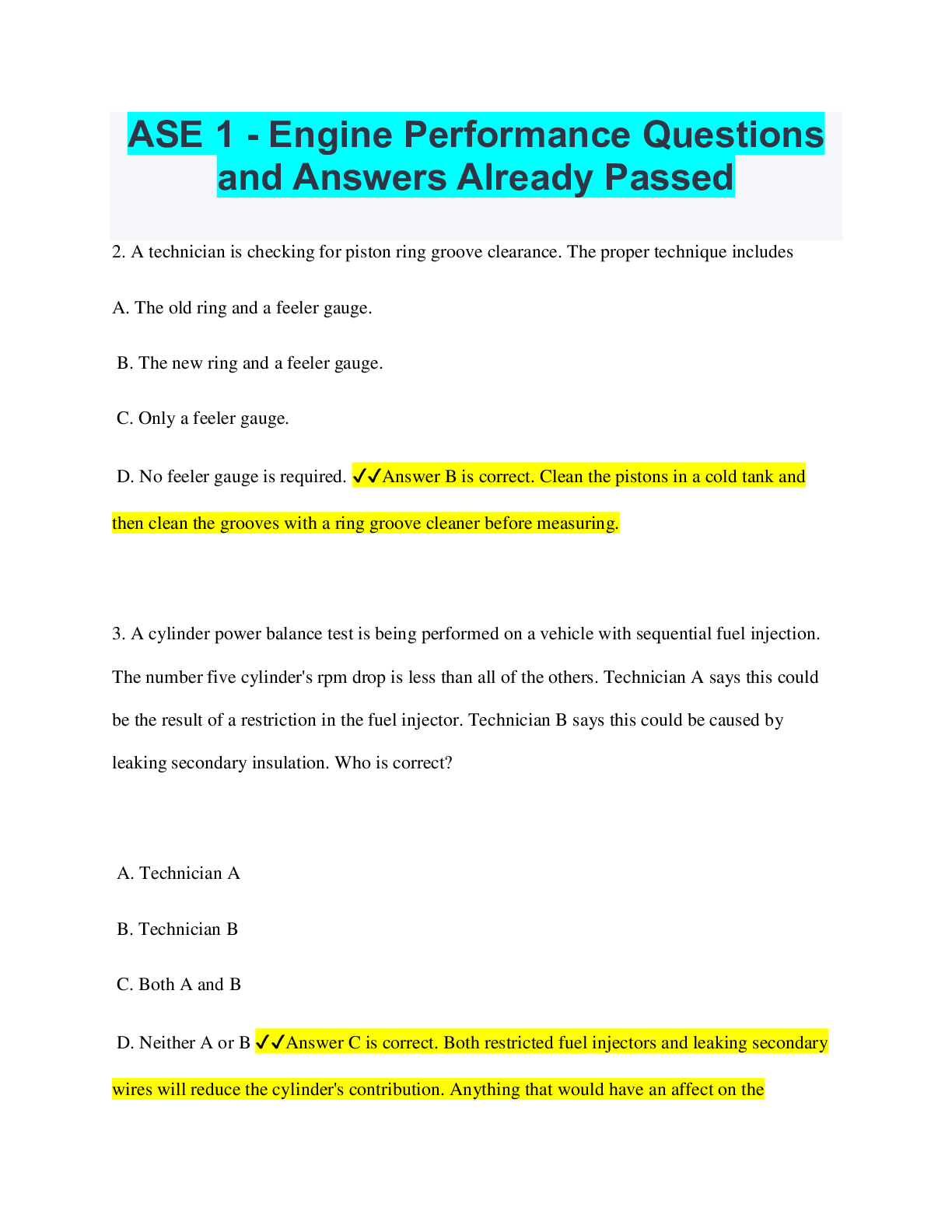 Engineering> QUESTIONS & ANSWERS > ASE 1 - Engine Performance Questions and Answers Already Passed (All)