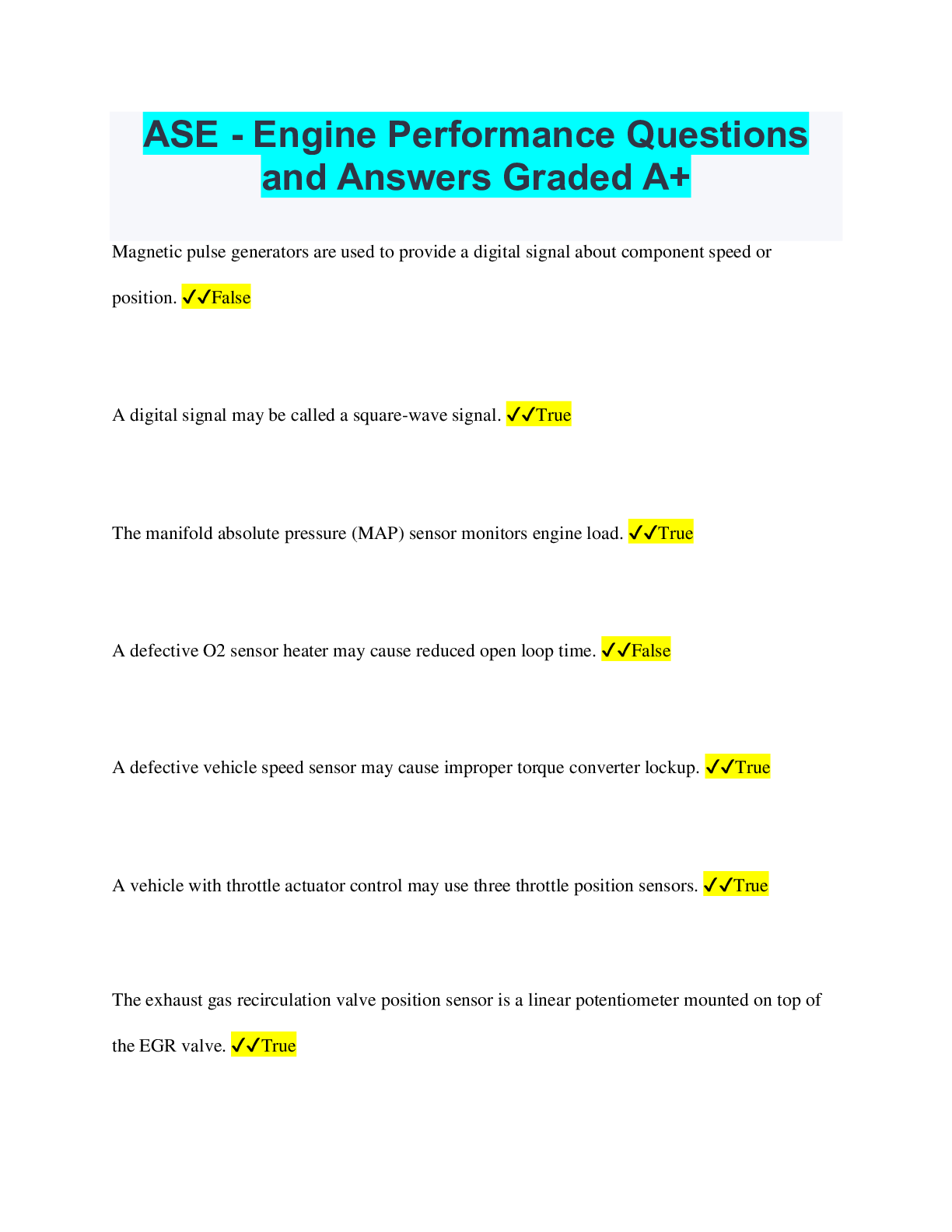 ASE - Engine Performance Questions and Answers Graded A+ Magnetic pulse generators are used to provide a digital signal about component speed or position. ✔✔False A digital signal may be called a...