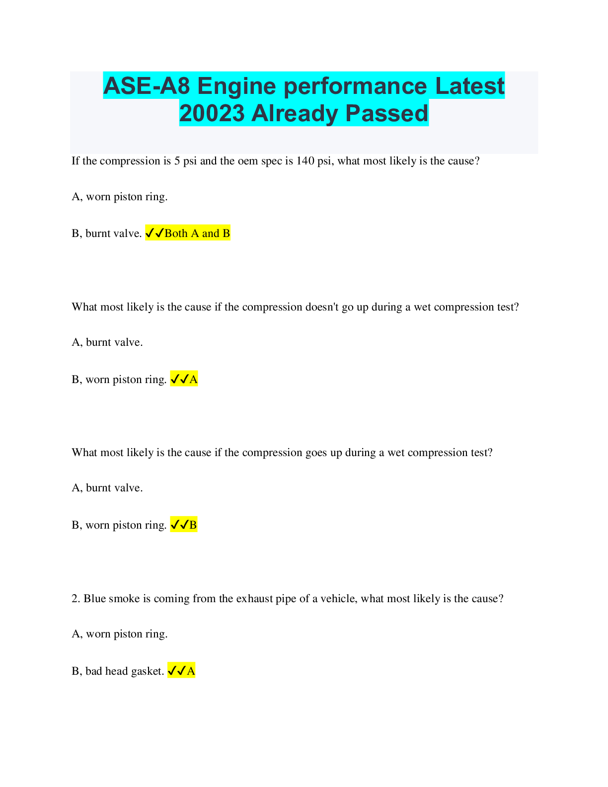ASE-A8 Engine performance Latest 20023 Already Passed If the compression is 5 psi and the oem spec is 140 psi, what most likely is the cause? A, worn piston ring. B, burnt valve. ✔✔Both A and B W...