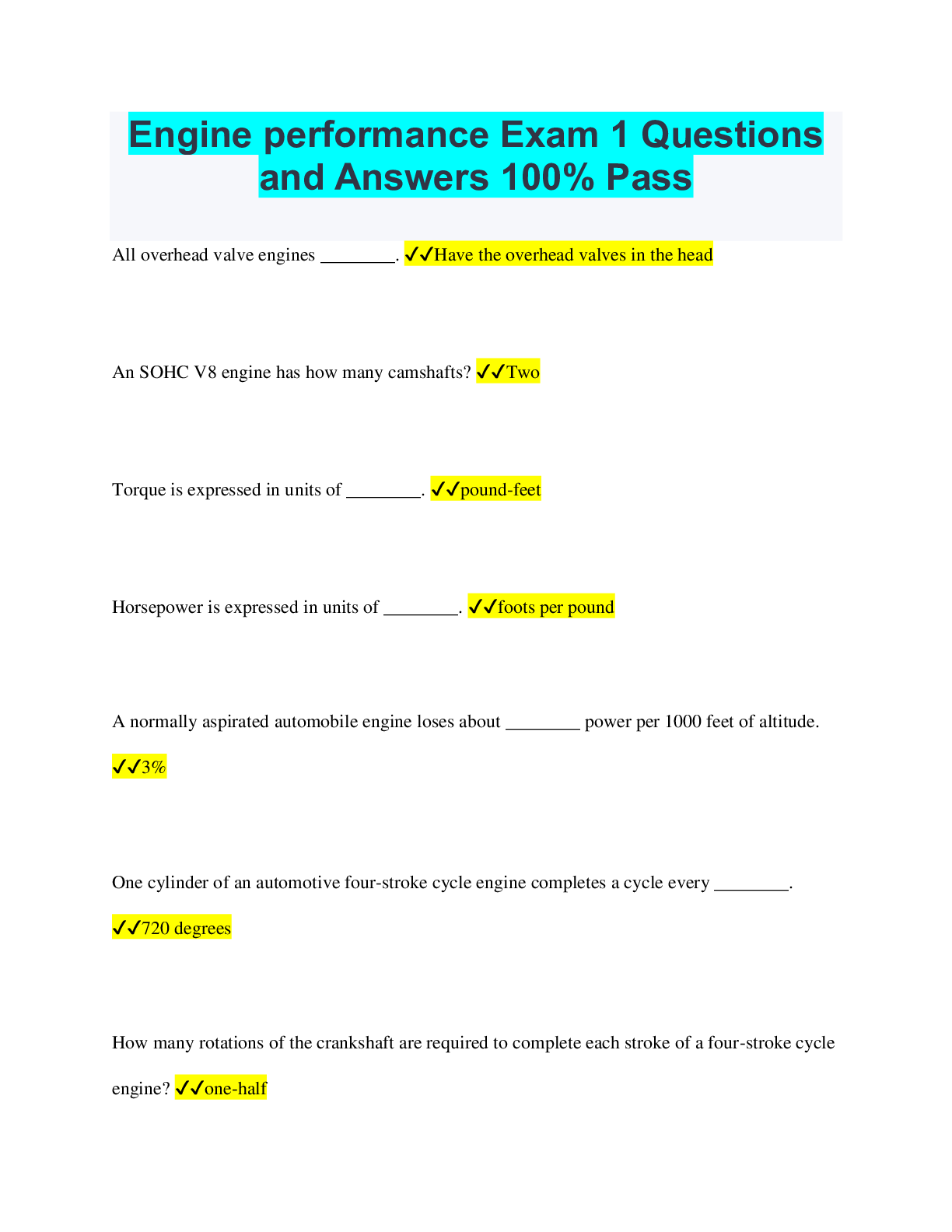 Engine performance Exam 1 Questions and Answers 100% Pass All overhead valve engines ________. ✔✔Have the overhead valves in the head An SOHC V8 engine has how many camshafts? ✔✔Two Torque is expr...