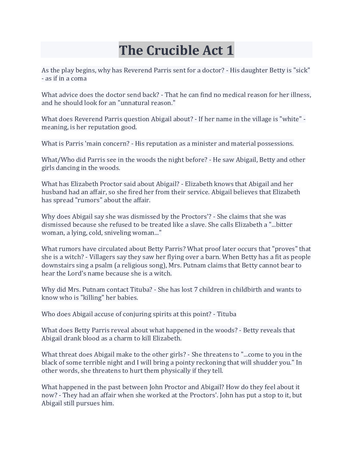 The Crucible ACT ONE LATEST UPDATE QUESTIONS AND ANSWERS