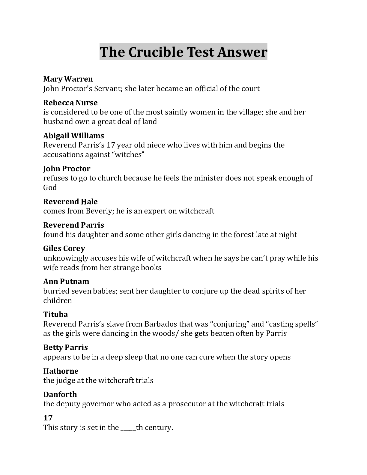 The Crucible Test Questions And Answer