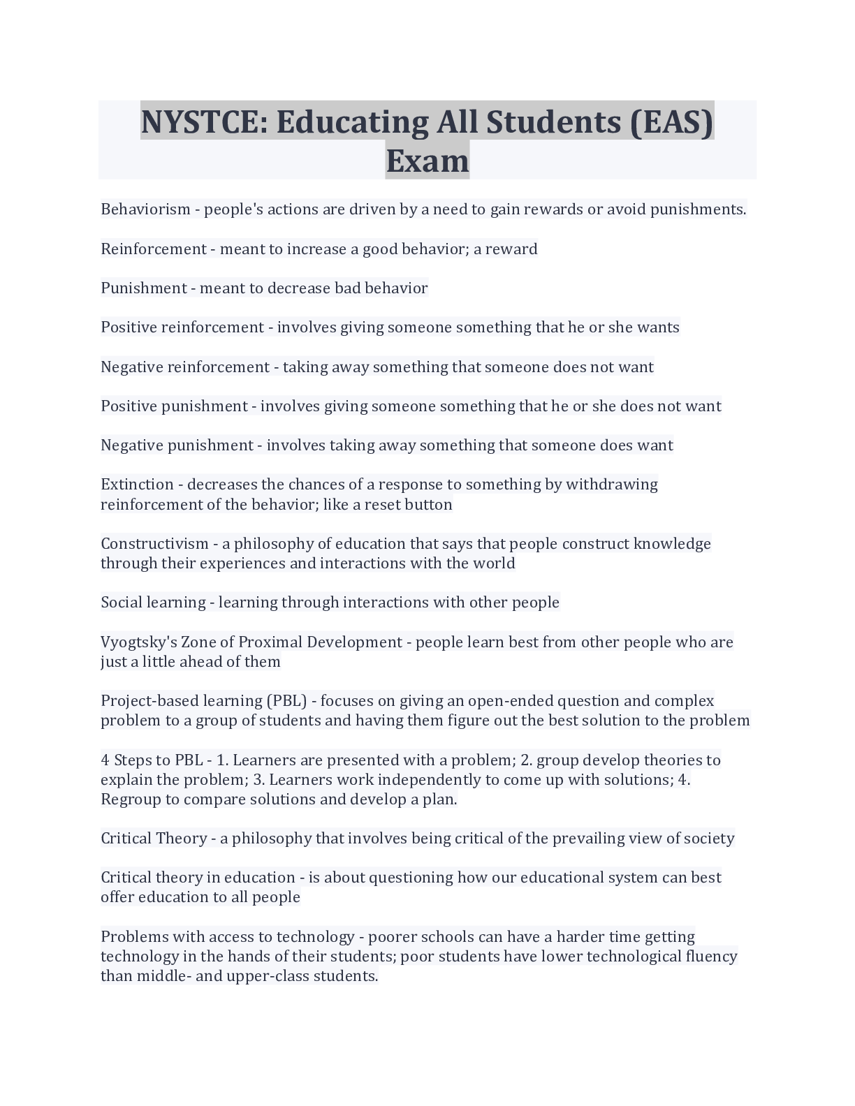 Education> EXAM > NYSTCE: Educating All Students (EAS) Exam Questions And Answers (All)