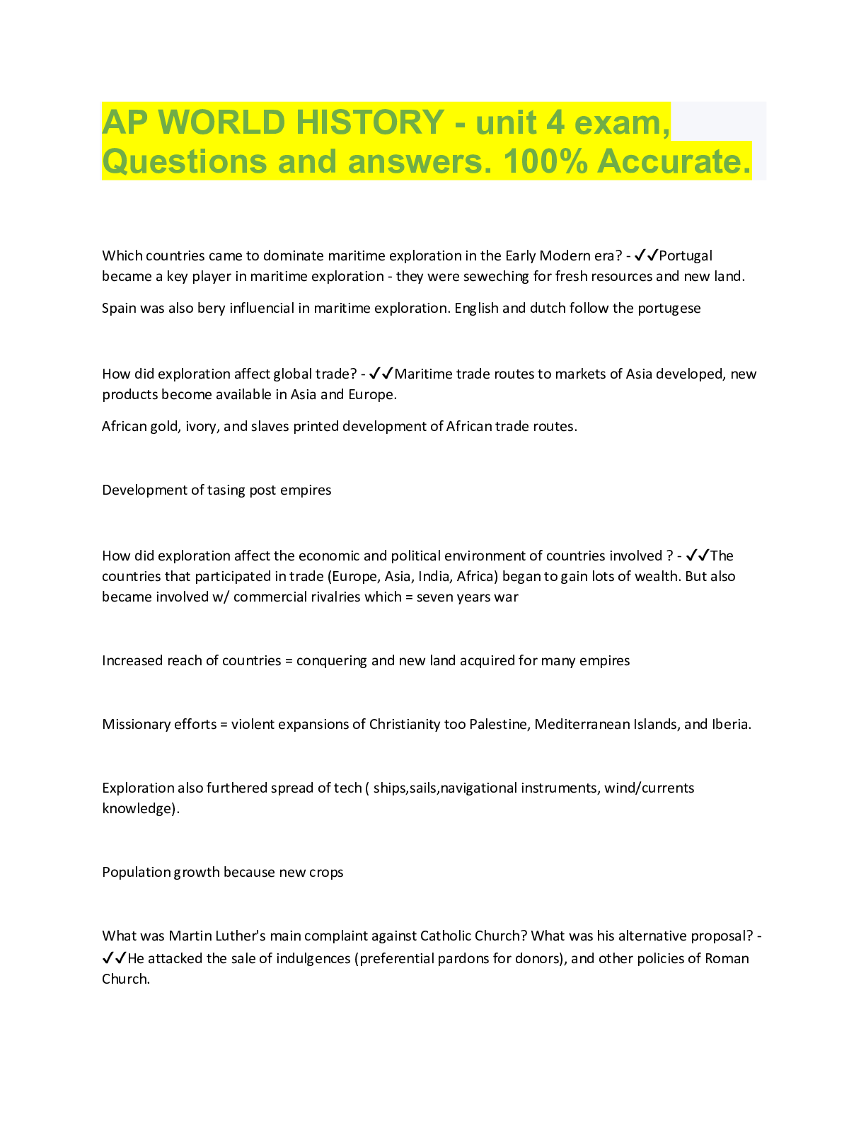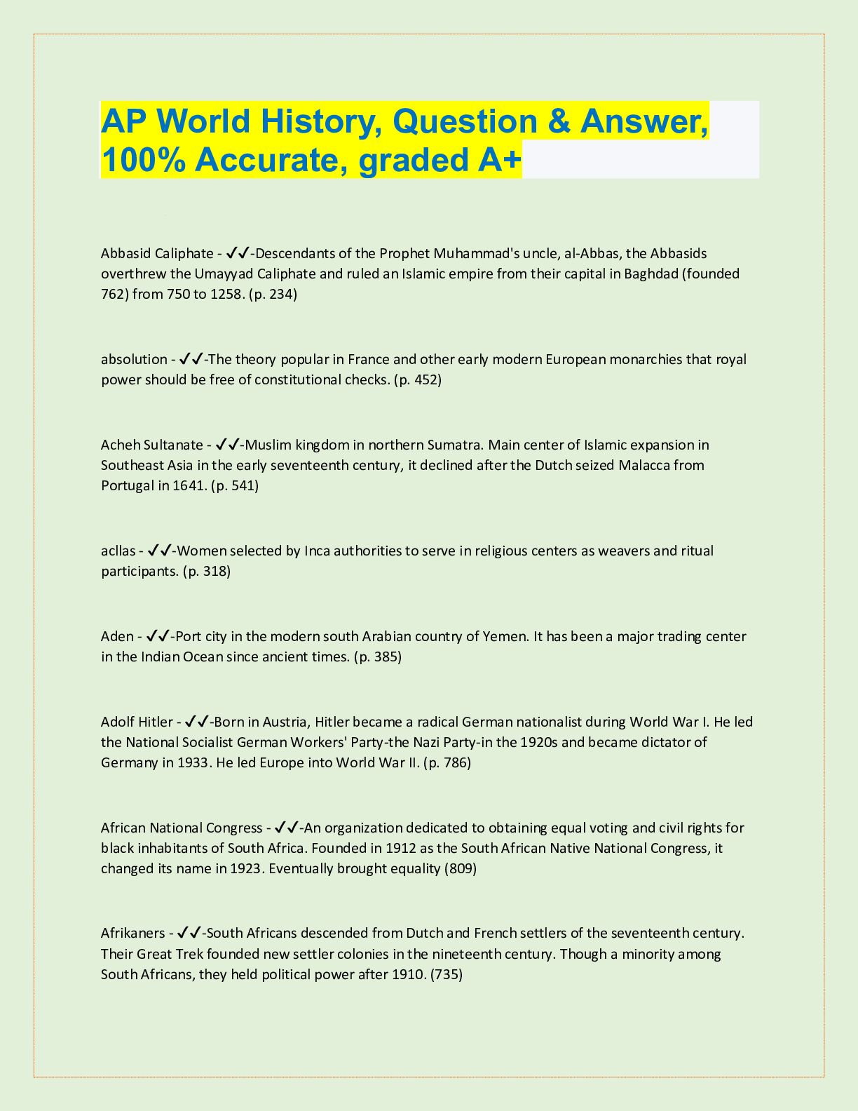 AP World History Exam Study Guide Questions and answers, 100% Accurate, graded A+. 25 VERSIONS, APPROVED... [Show More]