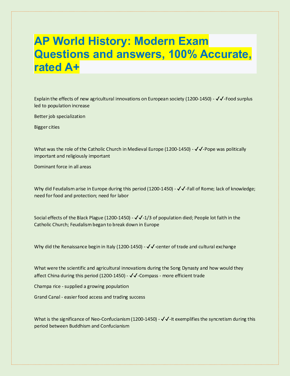 AP World History: Modern Exam Questions and answers, 100% Accurate, rated A+ Explain the effects of new agricultural innovations on European society (1200-1450) - ✔✔-Food surplus led to populati...