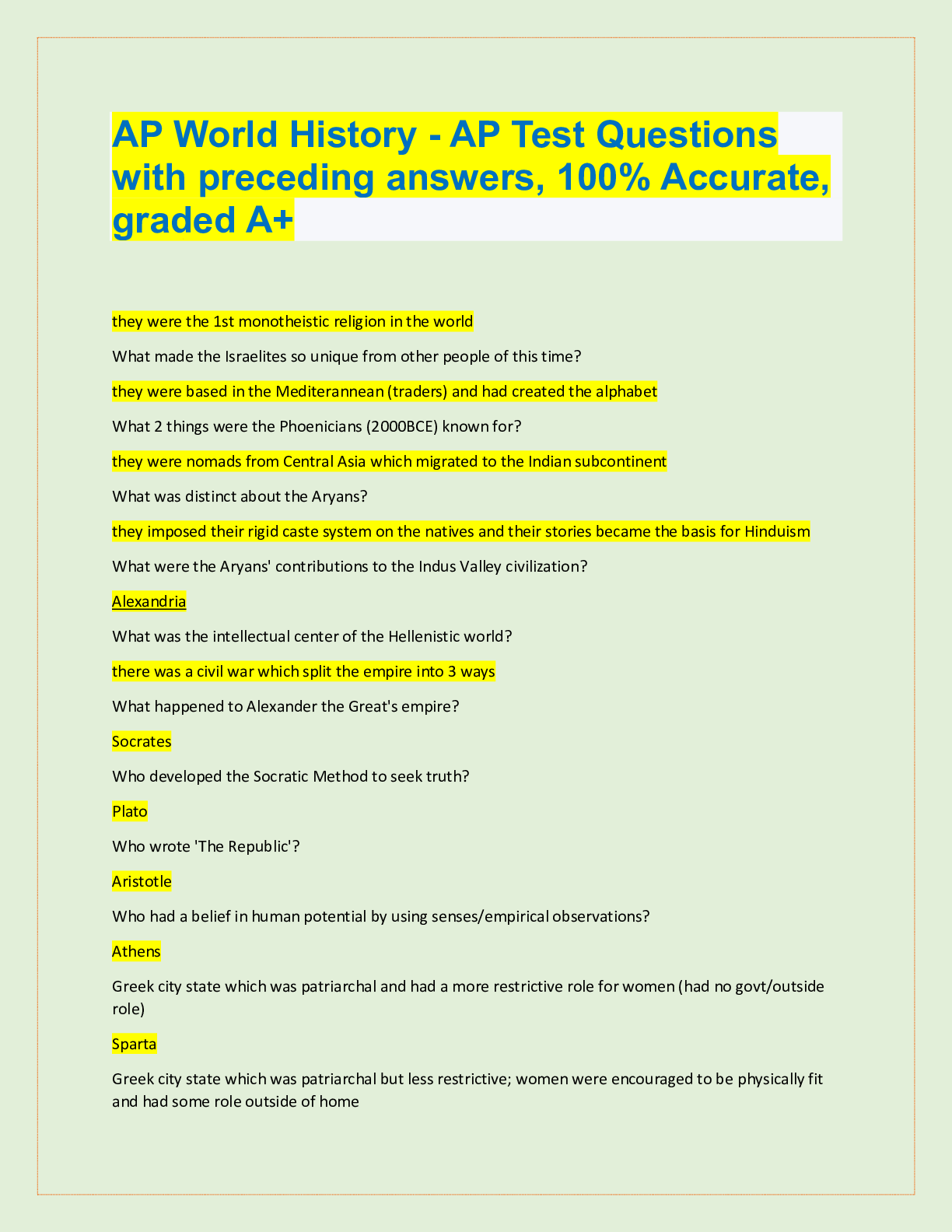 AP World History - AP Test Questions with preceding answers, 100% Accurate, graded A+ they were the 1st monotheistic religion in the world What made the Israelites so unique from other people of...