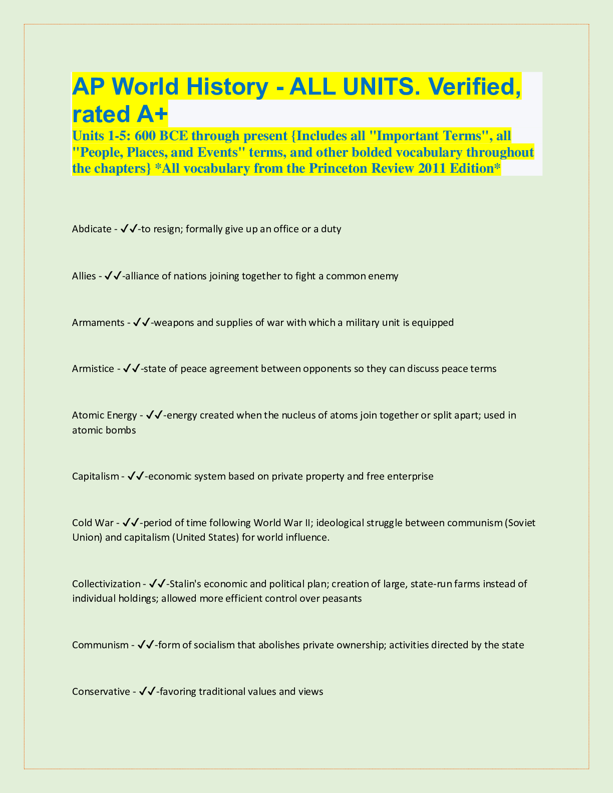 AP World History - ALL UNITS. Verified, rated A+ Units 1-5: 600 BCE through present {Includes all "Important Terms", all "People, Places, and Events" terms, and other bolded vocabulary throughout...