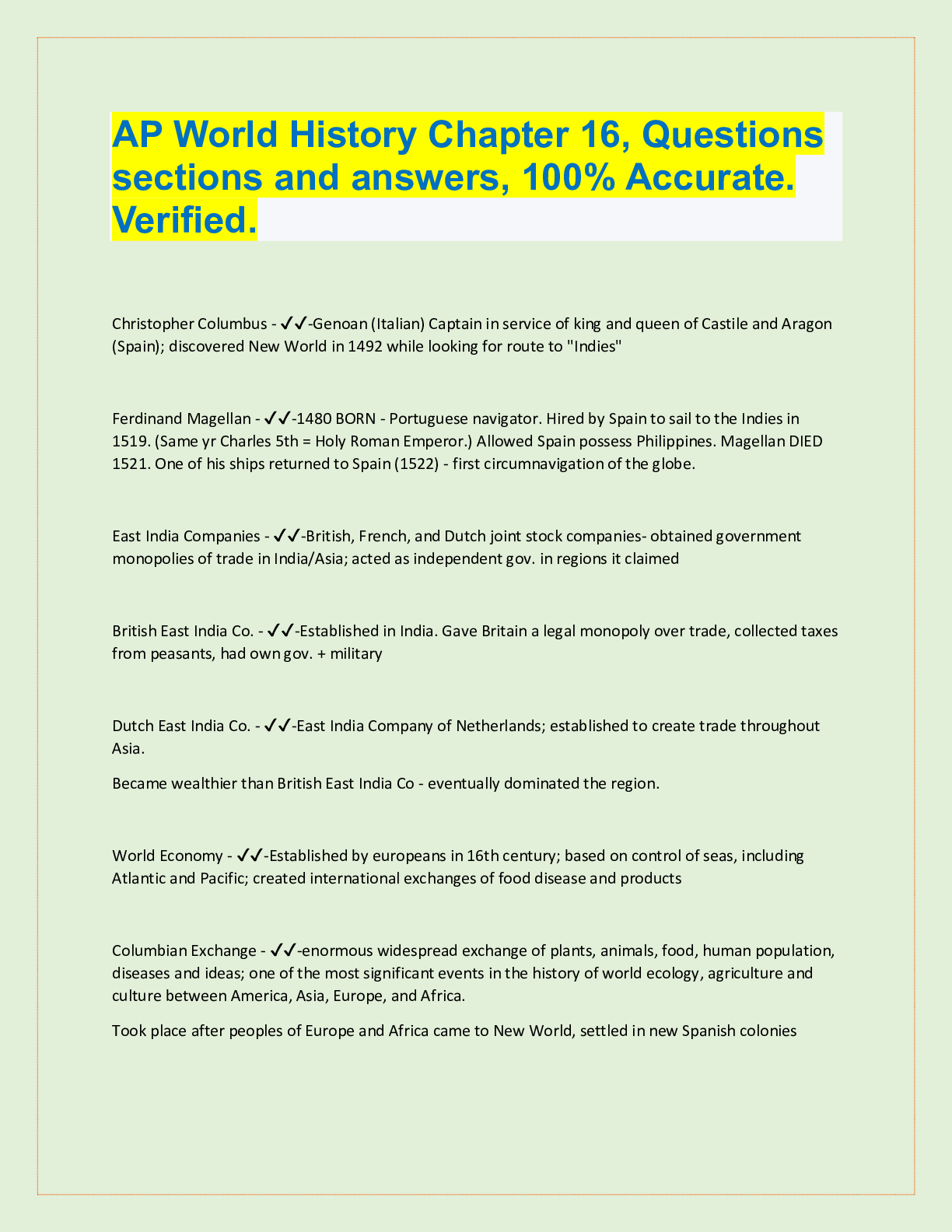 AP World History Chapter 16, Questions sections and answers, 100% Accurate. Verified. Christopher Columbus - ✔✔-Genoan (Italian) Captain in service of king and queen of Castile and Aragon (Spain...