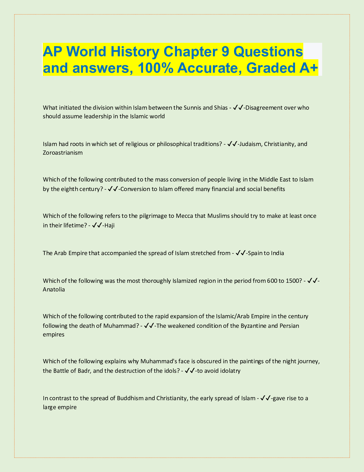 AP World History Chapter 9 Questions and answers, 100% Accurate, Graded A+ What initiated the division within Islam between the Sunnis and Shias - ✔✔-Disagreement over who should assume leadershi...