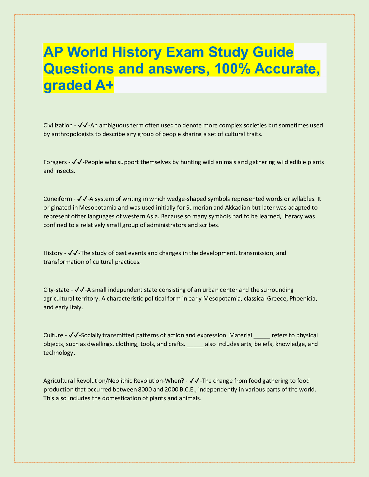 AP World History Exam Study Guide Questions and answers, 100% Accurate, graded A+ Civilization - ✔✔-An ambiguous term often used to denote more complex societies but sometimes used by anthropolo...